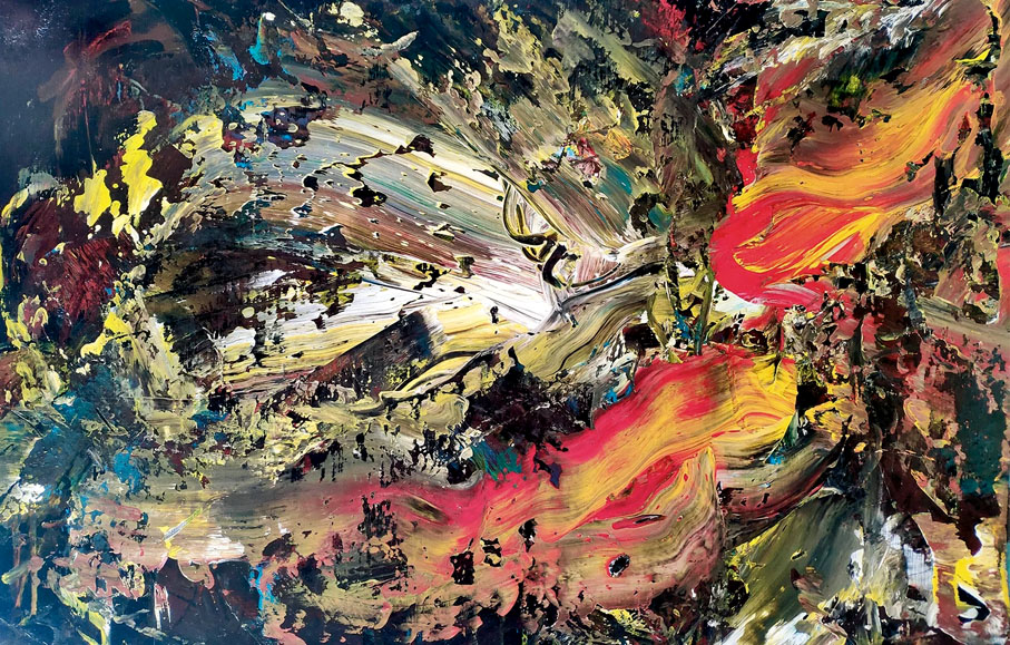 2007年2月出生的北京女孩劉馨茗,個子高高瘦瘦,她八歲開始正式接觸繪畫,如今已是一位多產的小畫家,迄今共創作畫作逾200幅,此次畫展《心目·黑暗中的綻放》便是她的部分畫作首展,共計四十餘幅。在一幅名為《雲》的畫作前,馨茗和爸爸劉勝國進行了一場有趣的創作體會漫談,她說,自己作畫的過程就是這世間颳過的風,落滿顏料的畫作就是這世間落下的雨,將天地連在一起的就是她每次駕馭的這場風和雨的顏色盛宴。畫中那深邃的線條與不拘一格的筆觸如離弦利箭般衝破了她的心裏,釋放出她的小宇宙,也震撼着觀看者的內心。
