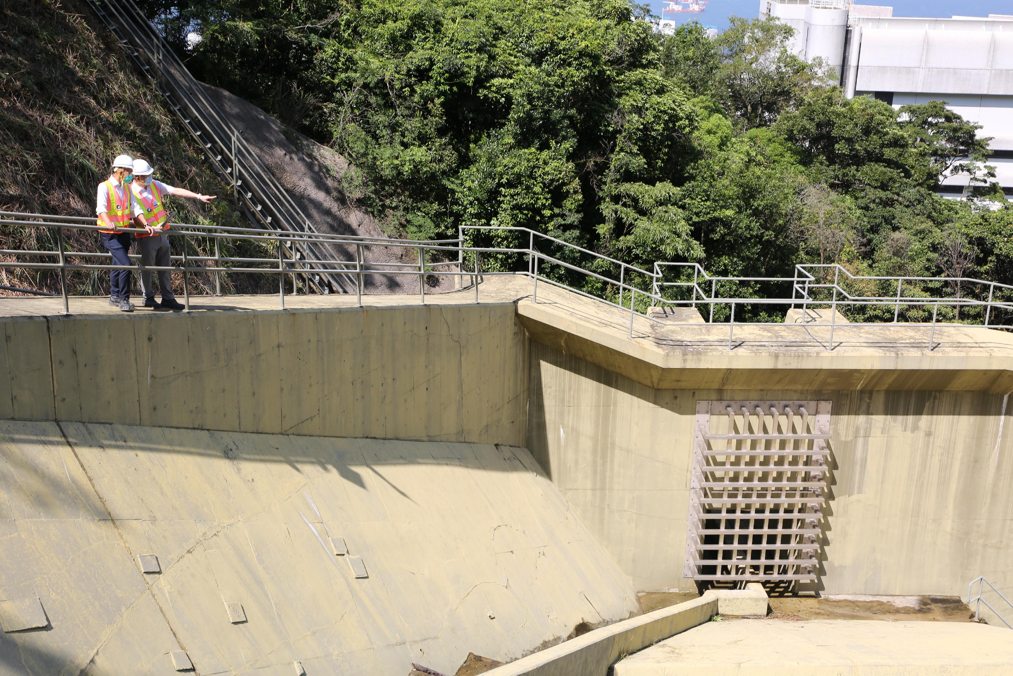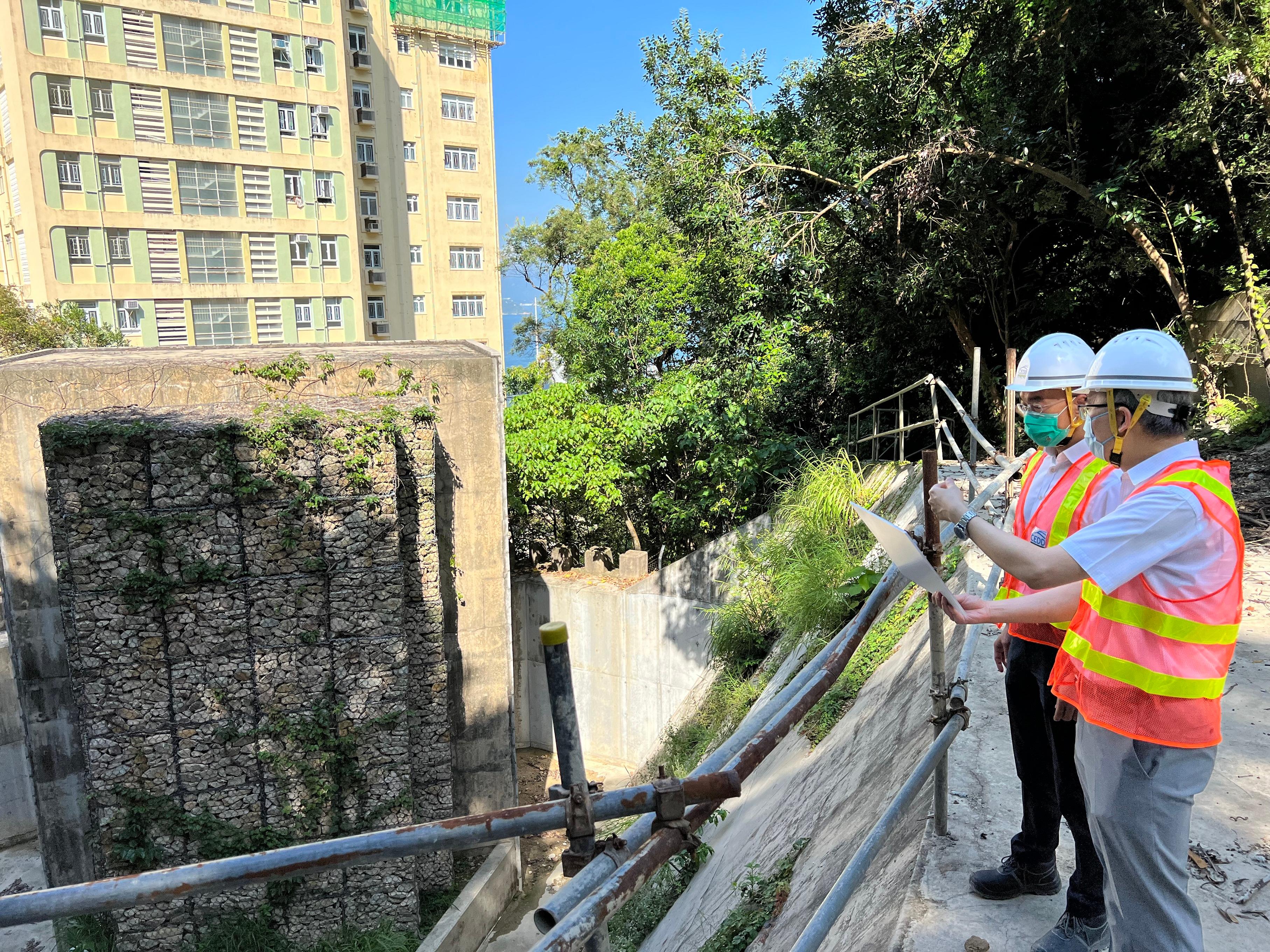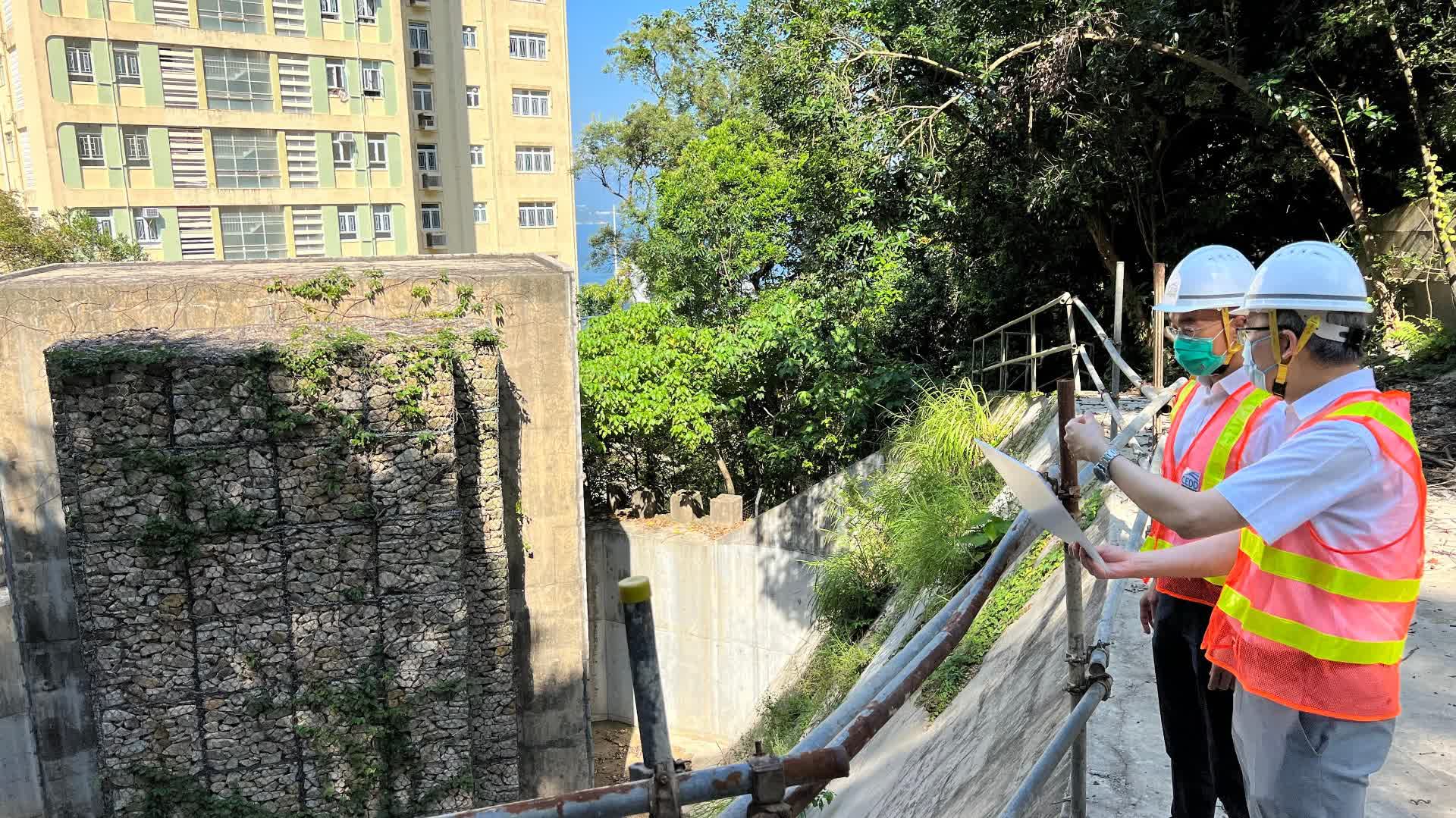 方學誠與土力工程處處長張偉文巡視位於明德村第3座後方的一幅泥石壩。該泥石壩於2013年建成,去年8月3日成功攔截從上方天然山坡塌下約110立方米的泥石流,避免明德村的設施受損。