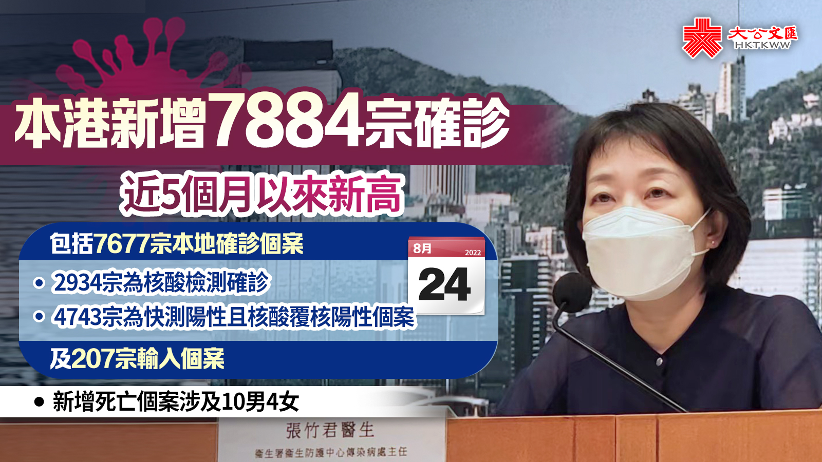 大公文匯全媒體報道,本港第五波疫情反彈持續,衞生署及醫管局今日(24日)下午舉行疫情記者會。衞生防護中心傳染病處主任張竹君公布,截至今日零時,本港新增7884宗確診個案,包括7677宗本地確診個案及207宗輸入個案。本地確診個案當中,2934宗為核酸檢測確診,4743宗為快測陽性且核酸覆核陽性個案。
