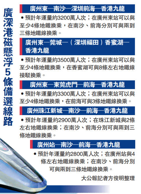 記者同時發現,5個線站位方案中,有3個方案計劃在南沙設站,有4個方案都途經前海。相關交通研究專家告訴大公報,之前有專家推薦「廣州東站─莞城─(福田)香蜜湖─香港九龍」線路,因為該線路途經廣深港三地發展成熟的市區,預計年客運量近3500萬人次。但他認為,線路較大選擇途經南沙、前海,以緊扣中央新印發的《全面深化前海深港現代服務業合作區改革開放方案》、《廣州南沙深化面向世界的粵港澳全面合作總體方案》的實施,預計年客運量逾2800萬到3300萬人次之間,加強與香港的互聯互通與融合發展。
