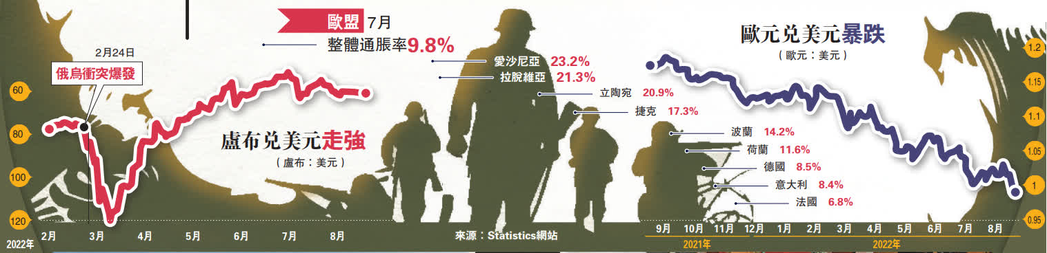受能源價格激增影響,歐盟7月整體通脹率達到9.8%,再創新高。由於市場擔心歐元區經濟衰退,歐元兌美元23日跌穿1:1平價,創20年新低。而盧布在3月中旬開始持續升值,4月初已恢復至俄烏衝突前水平,目前穩定在約60盧布兌1美元的高位。評論指,在世界經濟形勢不穩、西方國家制裁、美聯儲加息的背景下,盧布匯率能夠取得如此成績實屬不易,也戳破了西方「俄經濟將迅速崩潰」的謊言。