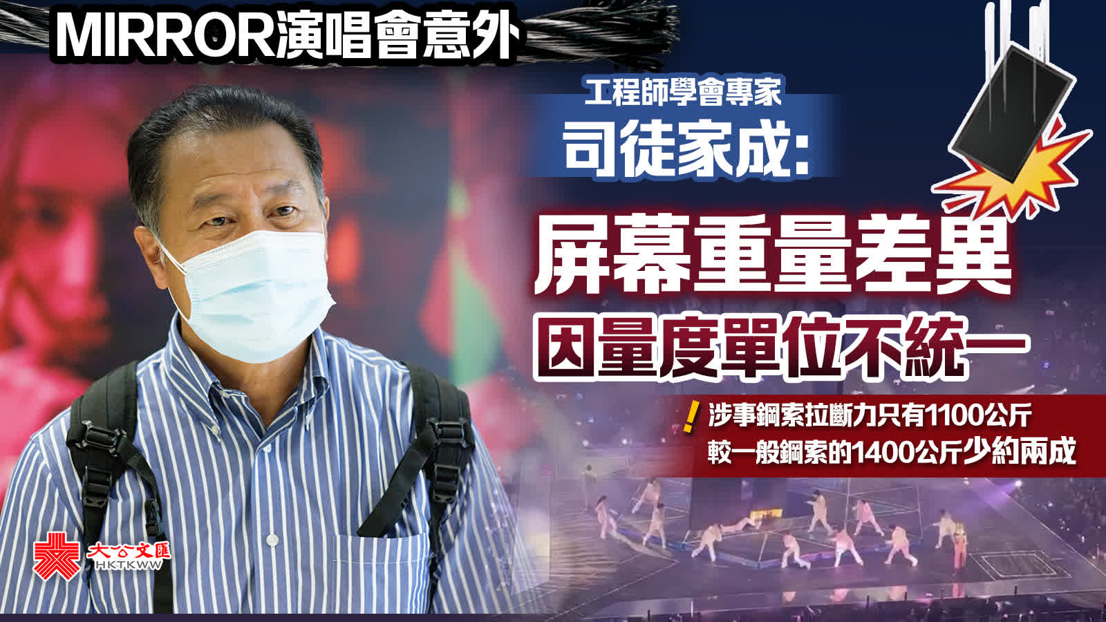 大公文匯全媒體報道,MIRROR紅館演唱會事故調查小組成員司徒家成今日(25日)在一節目指出,目前調查發現涉事鋼索拉斷力只有1100公斤,較一般鋼索的1400公斤少約兩成,至於墮下屏幕的實際重量與申報重量的差異,主要是公斤及市斤標示分別,並非如報道指相差達兩成,實際差異數據小組暫未能得知。