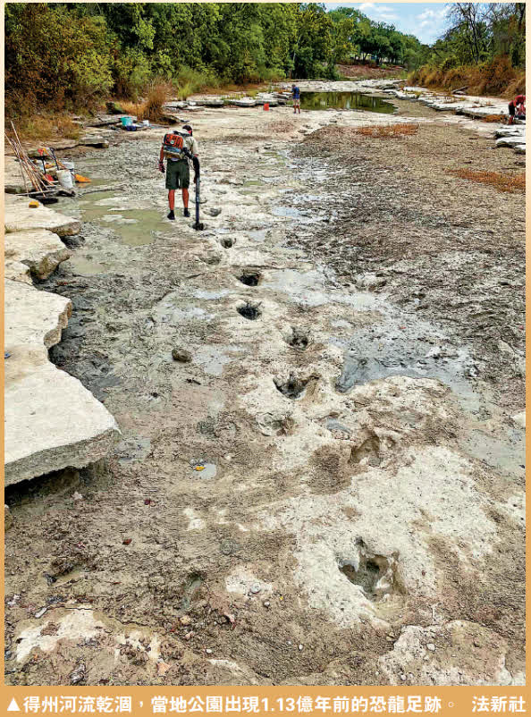 南部遭遇高溫乾旱,導致得州恐龍谷州立公園的河流乾涸,隱藏在河底的恐龍足跡重見天日,估計可追溯到1.13億年前。