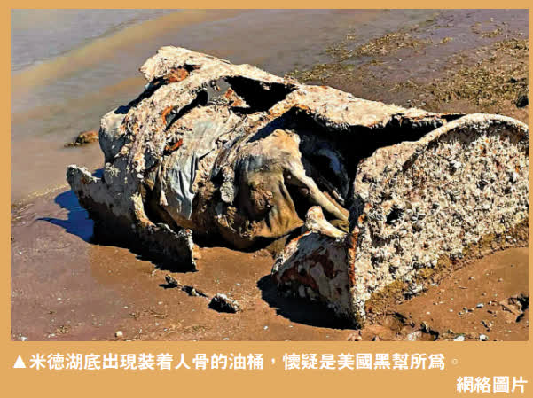 受長期乾旱影響,位於美國內華達州與亞利桑那州交界的米德湖水位下降,目前至少發現五具屍體,其中一具藏在油桶中。米德湖距離黑幫盤踞的「賭城」拉斯維加斯只有30分鐘車程,鐵桶藏屍也是黑幫的常用手法,接連發現的屍體可能都是黑幫犯罪的受害人。