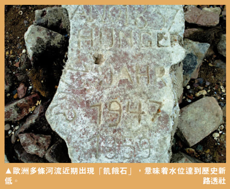 在捷克北部迪辛鎮附近的易北河段,一塊「飢餓石」(hunger stones)最近重見天日,上面的文字用德語寫成:「如果你看見我,就哭吧」。「飢餓石」其實是一些河床岩石,用於標記河流的低水位並警告後人。過去,如果河流水位落到如此之低,對許多人來說意味着貧窮與苦難。乾旱不但使莊稼受毀,同時也切斷了運輸糧食和各種供應的河道,之後便是饑荒的到來。