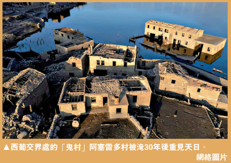 今年2月,位於西班牙與葡萄牙邊界處的「鬼村」阿塞雷多也重見天日。阿塞雷多村1992年被水淹沒,當時遷移到別處的原村民聞訊趕回故鄉,廢墟中清晰可見倒塌的房屋、鏽跡斑斑的汽車零件及生鏽的飲水機。