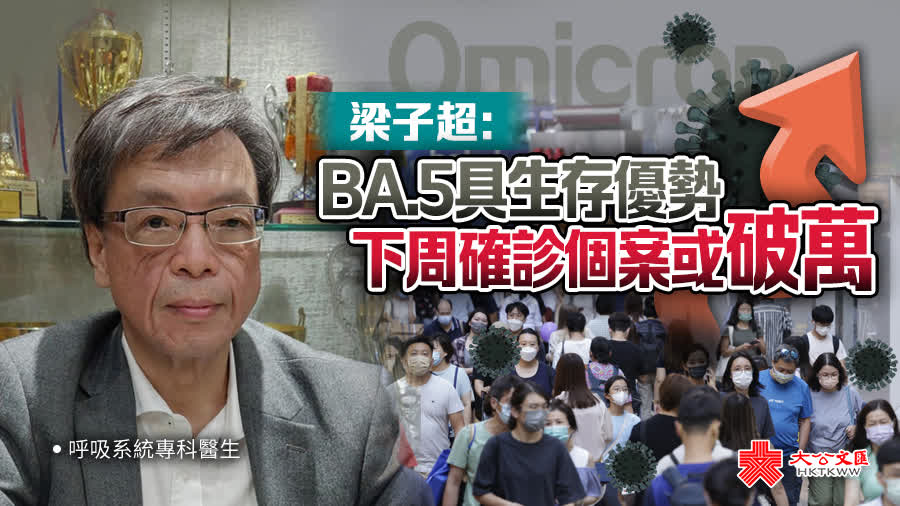 梁子超說,本港確診個案在過去兩周愈升愈快,今周較上周增加35%,Omicron BA.5病毒株上升速度快,每周升逾倍。他又指BA.5有生存優勢,無論對已接種疫苗或已感染人士都有強的免疫逃逸,他解釋指,如果Omicron BA.5對以往確診者的再感染機會仍然低,相信今波疫情的確診個案就不會太多。