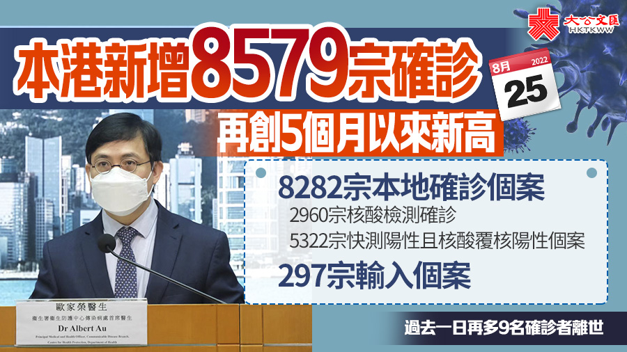 大公文匯全媒體報道,本港第五波疫情反彈持續,衞生署及醫管局今日(25日)下午舉行疫情記者會。衞生署衞生防護中心傳染病處首席醫生歐家榮公布,截至今日零時,本港新增8579宗確診個案,包括8282宗本地確診個案及297宗輸入個案。本地確診個案當中,2960宗為核酸檢測確診,5322宗為快測陽性且核酸覆核陽性個案。
