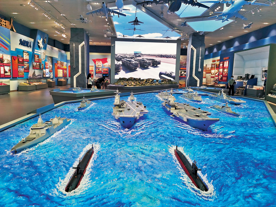 最引人矚目的莫過於「主戰裝備模型台」,這裏陳列着陸軍、海軍、空軍、火箭軍等多個軍兵種的裝備模型,包括人們熟悉的殲-20、運-20、山東艦、遼寧艦等國之重器的模型,反映了中國軍隊武器裝備建設的跨越式發展。此外,展廳現場還布設了有大量的圖表、視頻、藝術作品、互動展項。隆隆的炮聲、上空穿行的飛機、發射的導彈……讓觀眾有身臨戰場之感,彷彿能聞到那濃濃的硝煙味道。