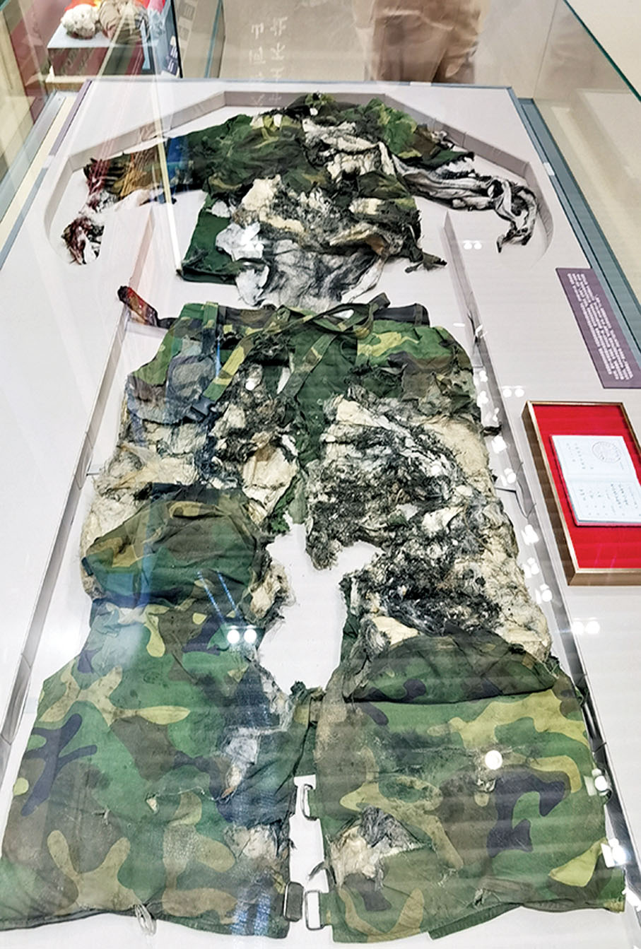 這件杜富國被炸傷時所穿的排雷服也在「領航強軍向復興——新時代國防和軍隊建設成就展」現場展出。排雷服的雙臂、腰身和雙大腿部分,已經被灼燒破碎,棉絮焦黑,綠色的迷彩布面也被巨大的衝擊波徹底撕碎,雖然「破得不能再破」,卻折射出中國軍人「至為可貴」的精神。