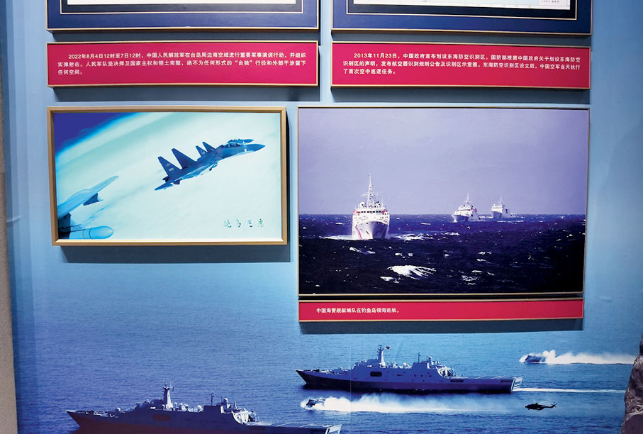 今年8月初,美國國會眾議長佩洛西突然竄訪台灣,引發國際社會一片嘩然。為有力反擊這種嚴重挑釁中國領土主權的惡劣行徑,中國人民解放軍作出了一系列有力的軍事反制。此次展覽也重點展出了中國軍隊組織東海、南海、黃海等重要海區和島礁警戒防衛,完成釣魚島維權、東海防空識別區管控、南海常態化戰巡、出島鏈遠海訓練、繞台島巡航等一系列重大任務。
