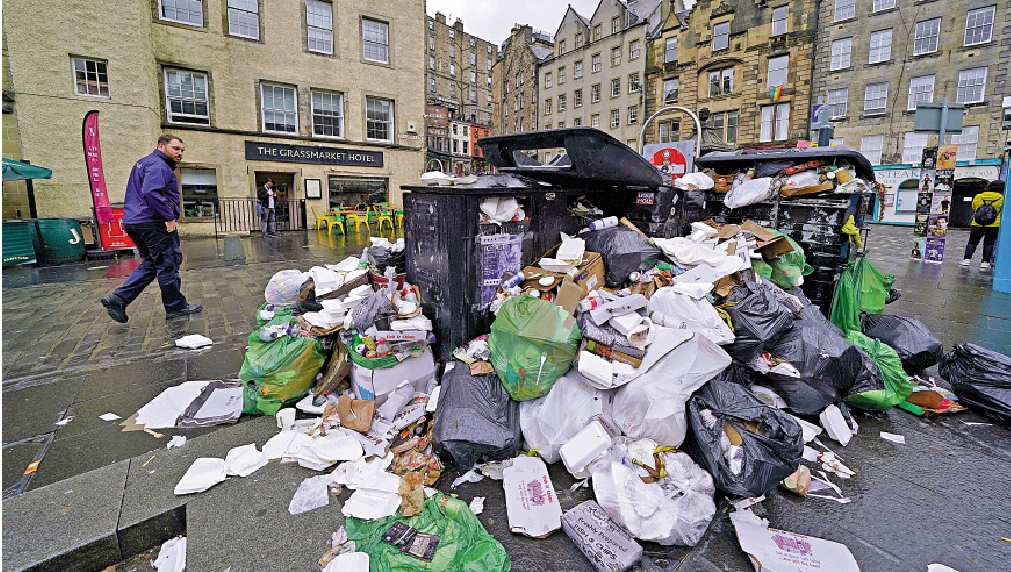 8月18日,愛丁堡垃圾處理部門員工不滿當局提出的3.5%加薪提議後,展開了長達12天的罷工。清潔工人罷工一周之後,愛丁堡「垃圾圍城」。從英媒發布照片上可以看到,愛丁堡街頭垃圾桶爆滿,垃圾袋堆積如山,堆積的垃圾超過六呎(1.83米),街道上滿是包裝袋、一次性杯子和飲料瓶,恐爆衞生災難,當地居民直呼場面「令人作嘔」。