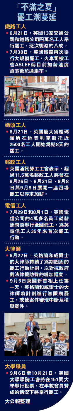 根據英國國家統計局17日公布的數據,7月份消費物價指數已升至10.1%,創下40年來新高。但是,民眾的薪資漲幅卻遠遠落後於通脹升高幅度,從6月份開始,「不滿之夏」罷工從鐵路交通工人發起後,律師、機場員工、郵局員工和以及其他行業從業人員紛紛走上街頭,舉行抗議活動。