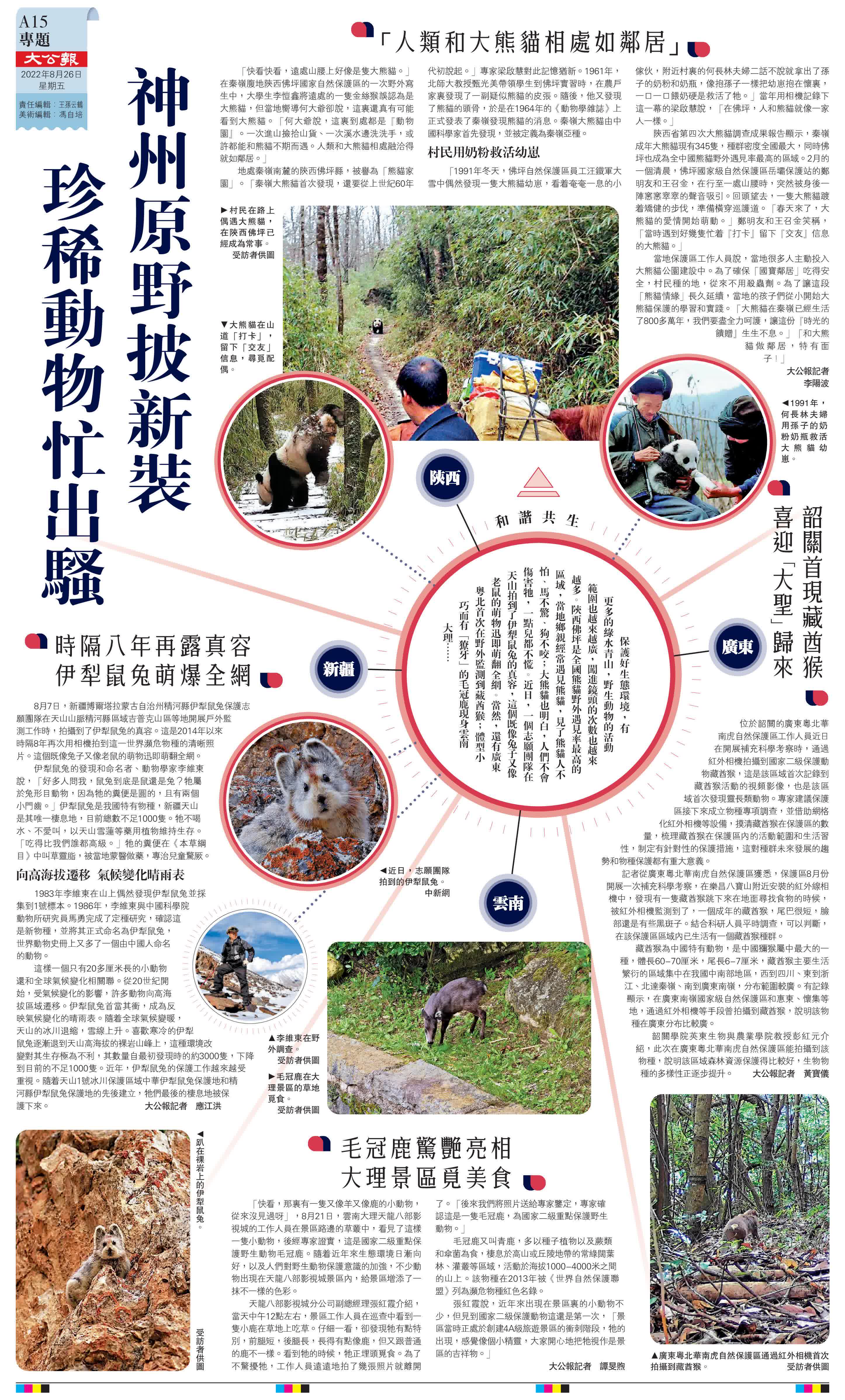 (大公報記者 李陽波 應江洪 黃寶儀 譚旻煦)保護好生態環境,有更多的綠水青山,野生動物的活動範圍也越來越廣,闖進鏡頭的次數也越來越多。陝西佛坪是全國熊貓野外遇見率最高的區域,當地鄉親經常遇見熊貓,見了熊貓人不怕、馬不驚、狗不咬;大熊貓也明白,人們不會傷害牠,一點兒都不慌。近日,一個志願團隊在天山拍到了伊犁鼠兔的真容,這個既像兔子又像老鼠的萌物迅即萌翻全網。當然,還有廣東粵北首次在野外監測到藏酋猴;體型小巧而有「獠牙」的毛冠鹿現身雲南大理……