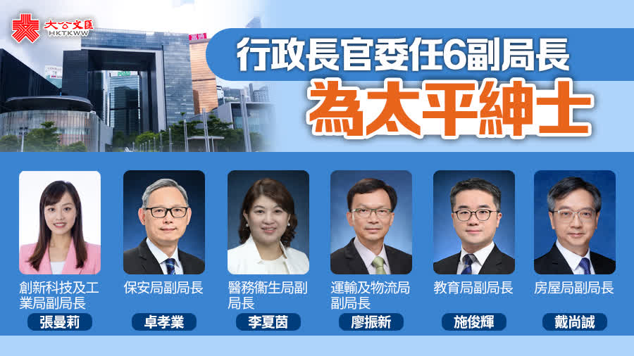 大公文匯全媒體報道,行政長官李家超依據《太平紳士條例》所賦予的權力,委任6名特區政府官員為太平紳士,今日(26日)起生效。
