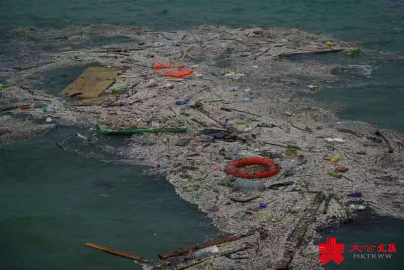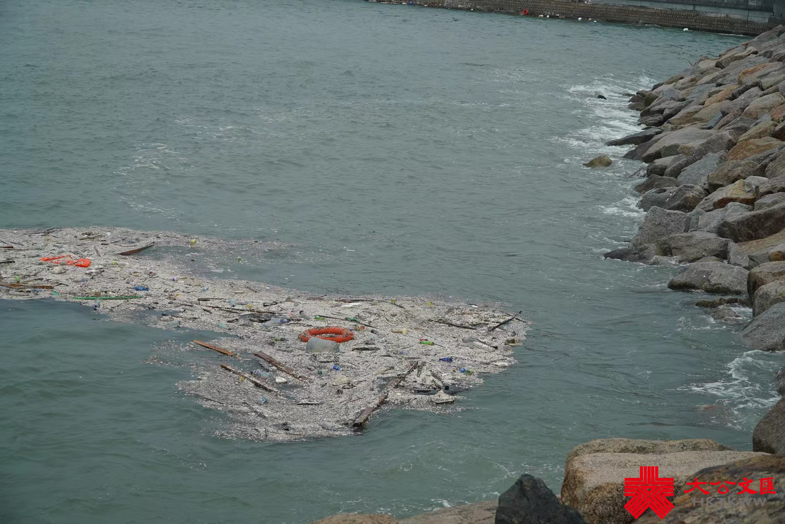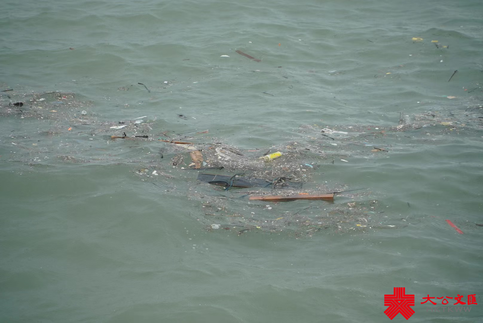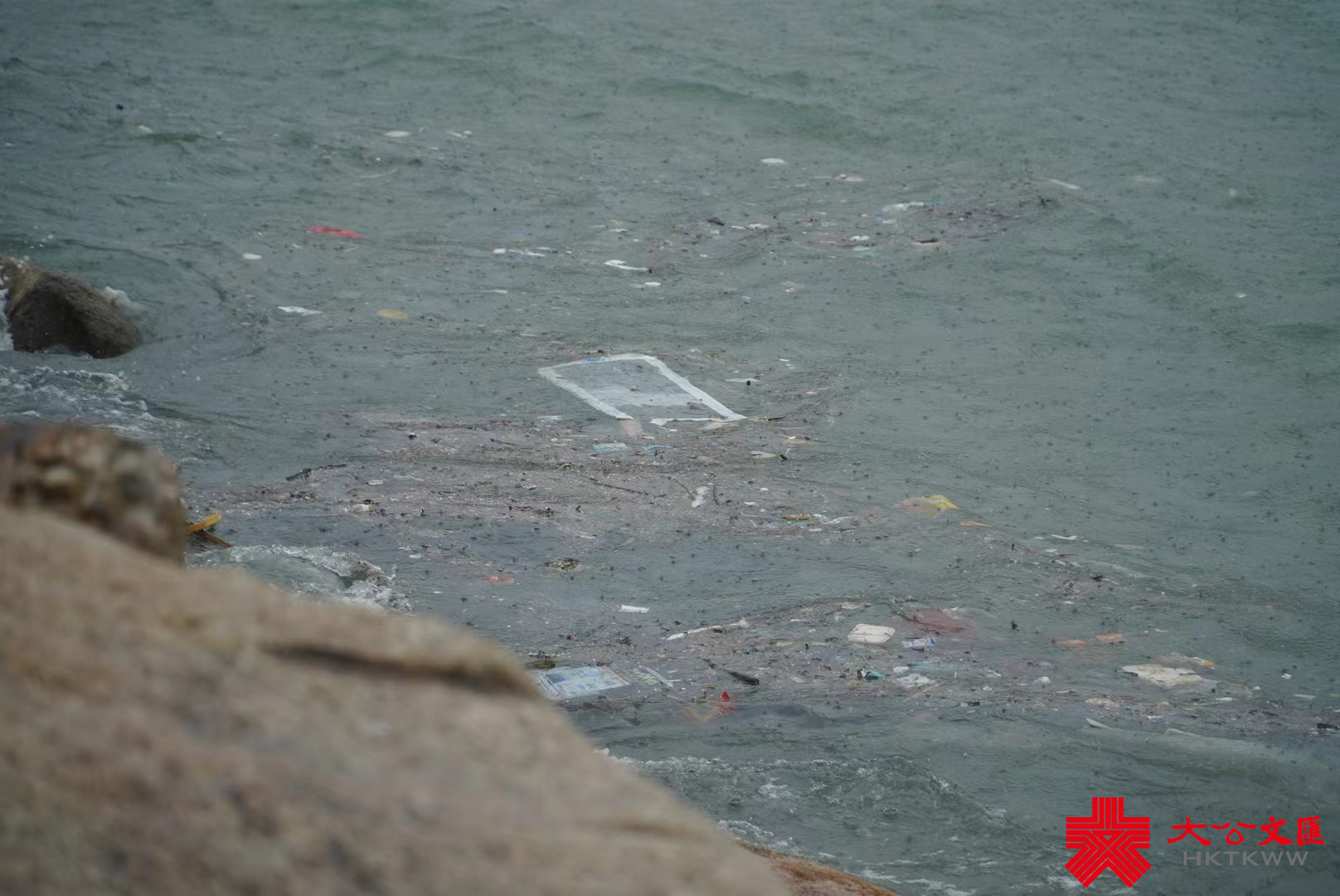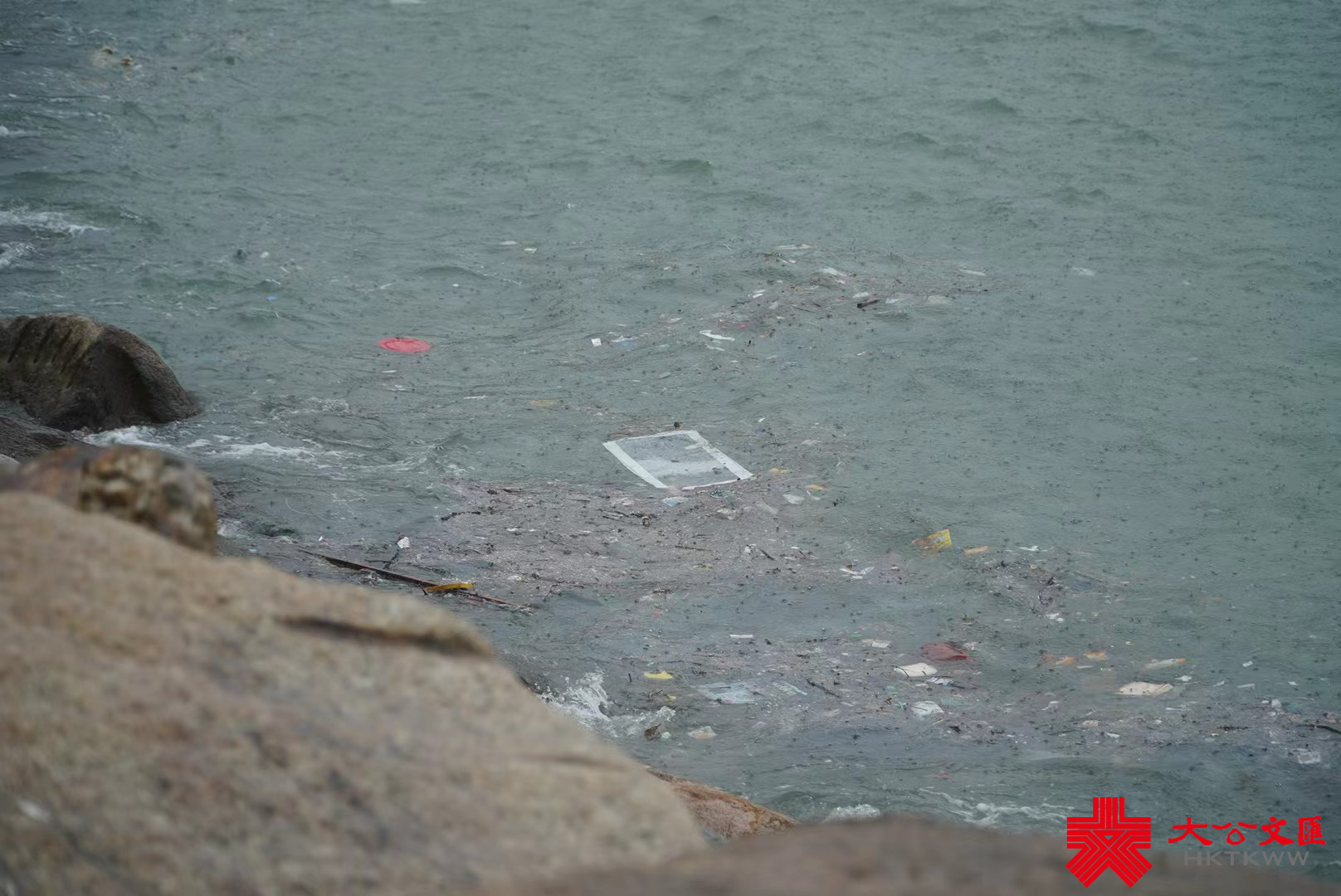 大公文匯全媒體報道,記者今日(26日)在將軍澳海濱見到,「馬鞍」襲港後水中滿布被巨浪沖到海濱及岸上的雜物和垃圾。望向海面,即見到有不同大小的垃圾在水面漂浮,例如食物包裝袋、膠桶、尼龍袋、廢棄救生圈等,在岸上更見一堆破碎粒子與細沙混合,情況非常惡劣。