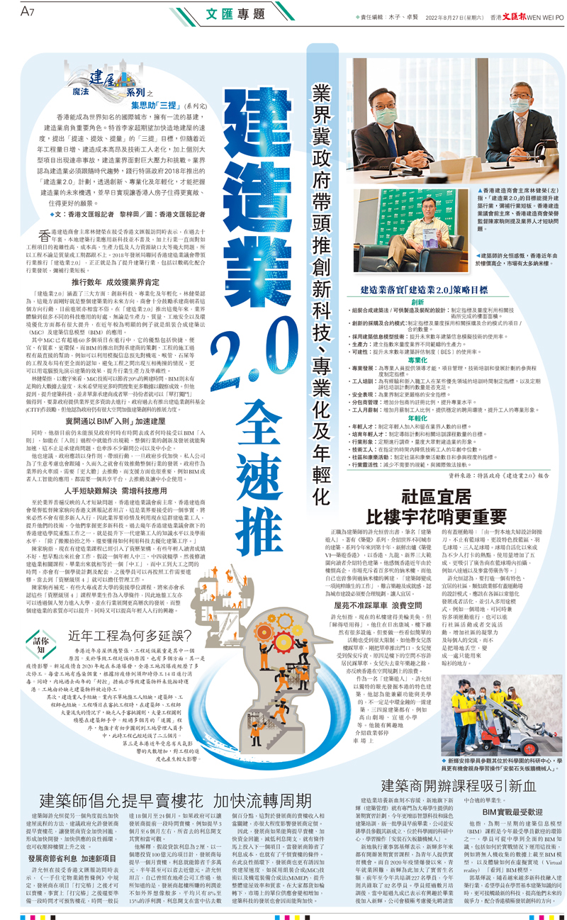 同時,他指目前仍未能預見政府何時有時間表或者何時接受以BIM「入則」,如能在「入則」過程中就能作出規範,整個行業的創新及發展就能夠加速,這不止是承建商問題,也牽涉不少顧問公司以及中小企。
