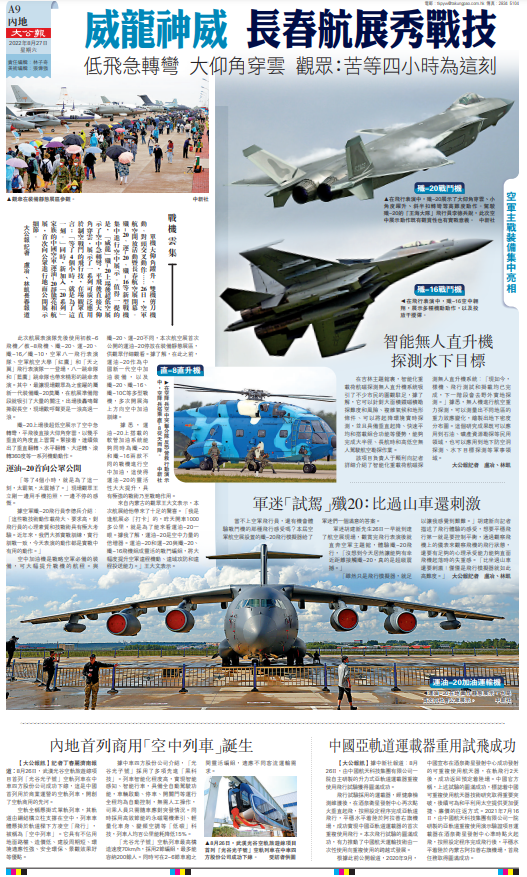 【大公報記者 盧冶、林凱長春報道】單機大仰角躍升、雙機剪刀機動、對頭交叉動作……26日,空軍航空開放活動暨長春航空展開幕。殲-20、運-20、殲-16等新型戰機集中進行空中展示。值得一提的是,「威龍」殲-20上場後超低空展示了空中急轉彎,平飛後直接大仰角穿雲,展示了一系列可廣泛應用於制空戰鬥的飛行技,在場觀眾直言:「等了4個小時,就是為了這一刻。」同時,新加入「20系列」家族的中國空軍運油-20靜態亮相航展,首次向公眾進行地面公開展示細節。