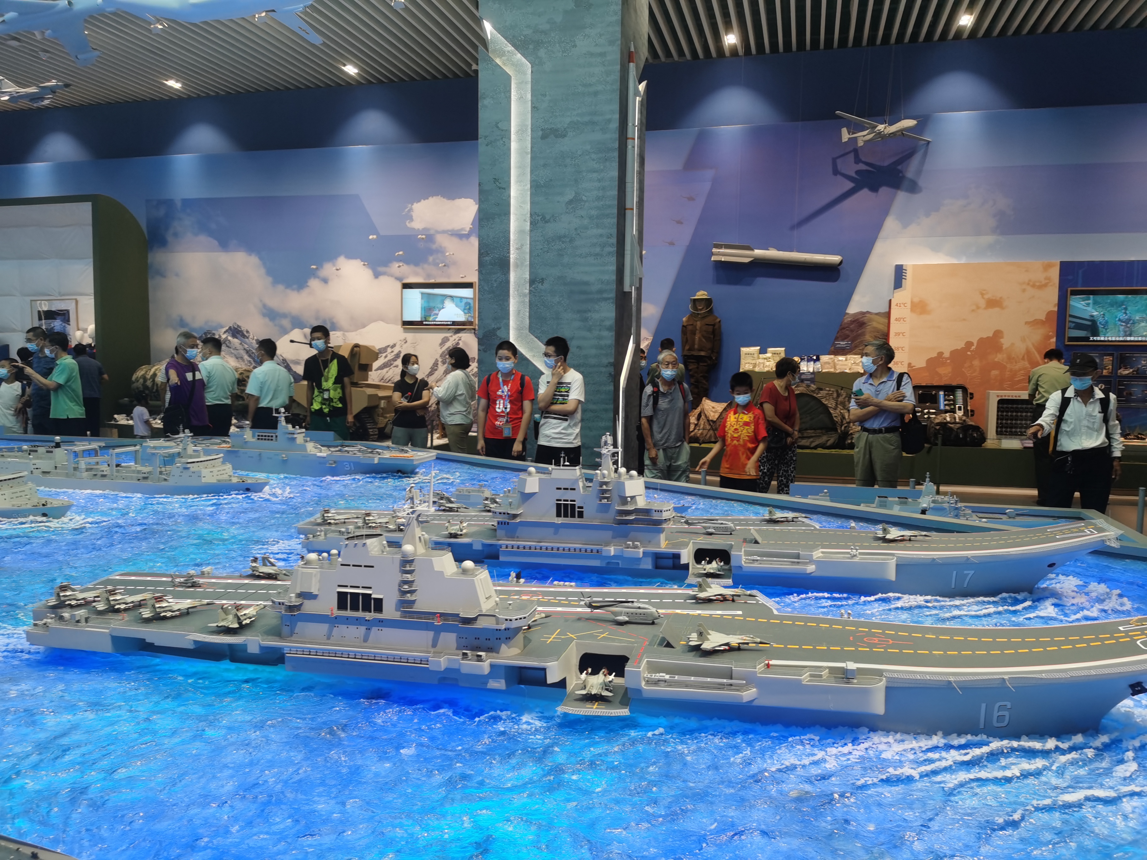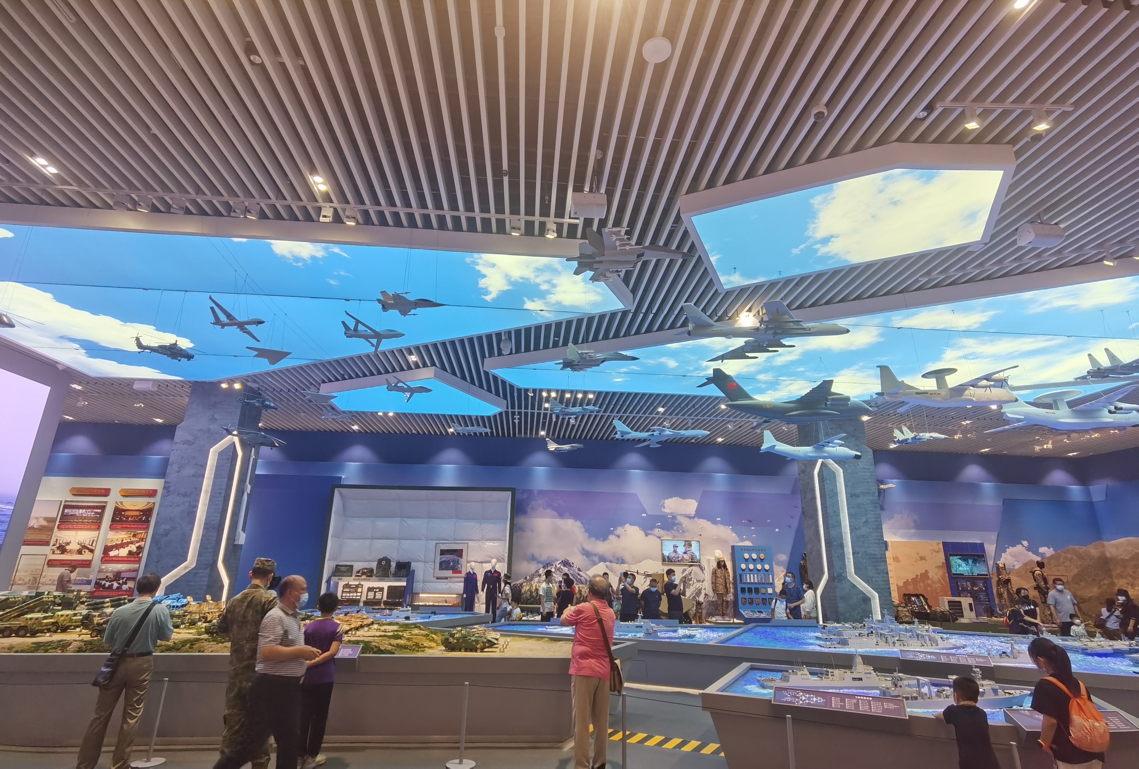 進入展廳裏,巨大的「主戰裝備模型台」格外引人註目的,殲-20、運-20、山東艦、遼寧艦等國之重器在這裏可以盡收眼底。參觀者王先生由衷讚嘆說,以前中國被動挨打,如今看到軍隊建設的進步巨大,特別是近年武器裝備發展特別大,尤其對海軍航母、新型驅逐艦、核潛艇和軍隊作風建設取得的成就印象深刻。他說,軍隊強大起來了,才能為經濟建設和國家發展創造更好的外部環境。