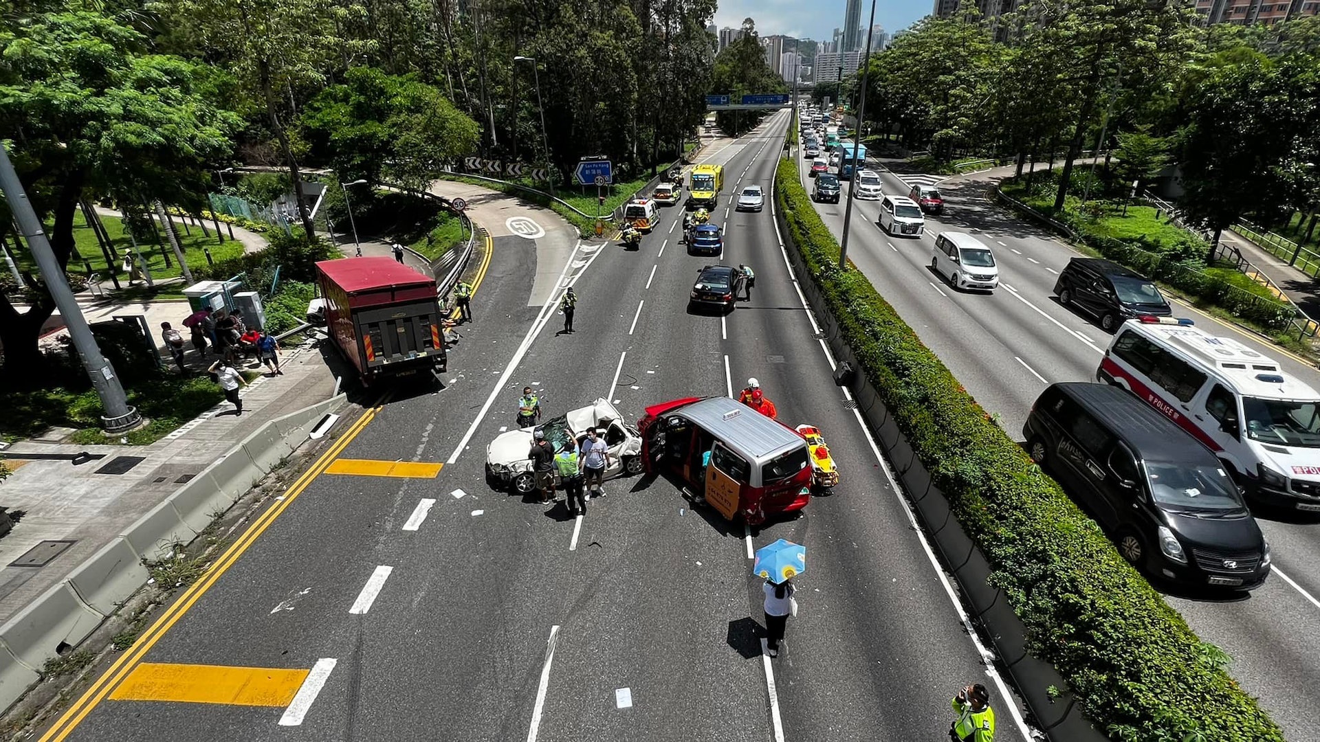 現場所見,涉事車輛橫亘路中,一輛白色私家車車尾嚴重壓扁,另一貨車撞毀路邊欄桿,零件四散。