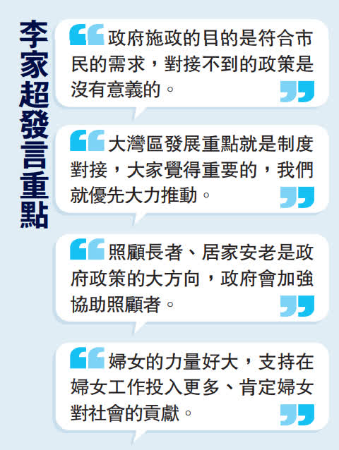 李家超指出,政府重視青年培育與發展,希望令年輕人更有興趣追求夢想。他認同應把青年幹事計劃「發揚光大」,增加青年參政議政空間;政府亦了解未必所有青年喜歡投身學術,故多元發展有重要性,支援青年就業、創業亦是施政目標。對於兩地交流,他認可需在當地生活一段時間才有助深入了解文化,感謝大家提議幫助制訂相關政策計劃。