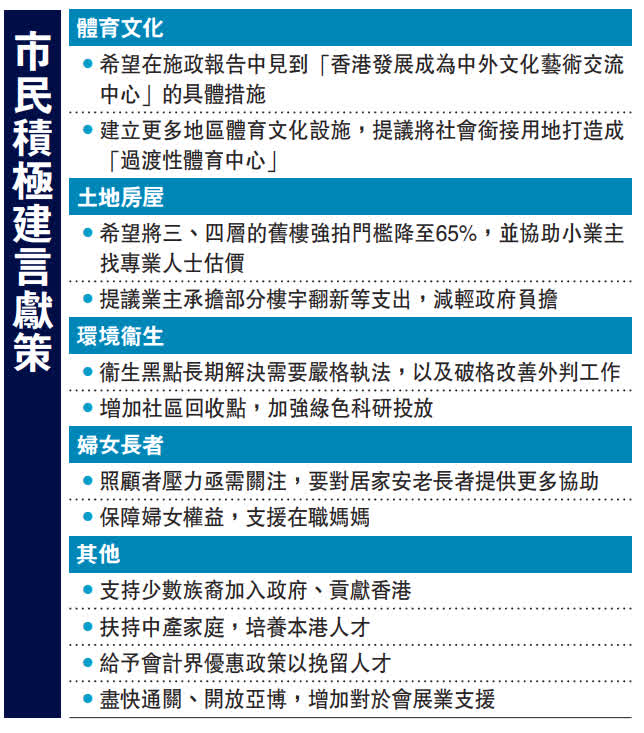 又有多名中小學校長建議繼續優化香港教育系統,減輕中小學生課業負擔、增加課外活動,同時落實小班教學,迎合學生多元發展的不同需要。另有教育界人士表示,許多青少年在事業上有非傳統職業的追求,建議政府給予更多支援。人才政策上,有市民關注香港吸引高端人才政策不足,有畢業生選擇離港,希望政府創造條件挽留人才。