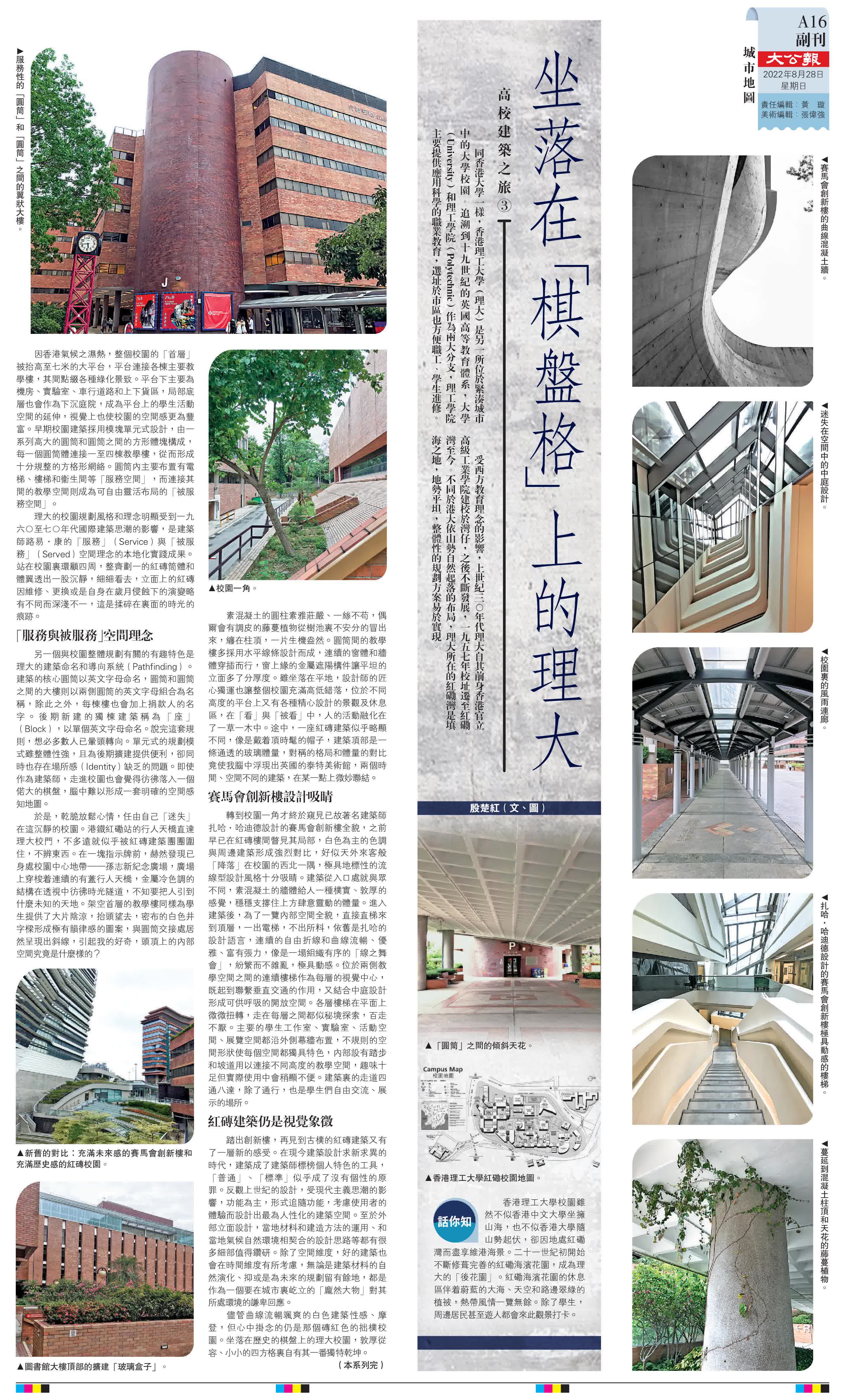 理大的校園規劃風格和理念明顯受到一九六○至七○年代國際建築思潮的影響,是建築師路易·康的「服務」(Service)與「被服務」(Served)空間理念的本地化實踐成果。站在校園裏環顧四周,整齊劃一的紅磚筒體和體翼透出一股沉靜,細細看去,立面上的紅磚因維修、更換或是自身在歲月侵蝕下的演變略有不同而深淺不一,這是揉碎在裏面的時光的痕跡。