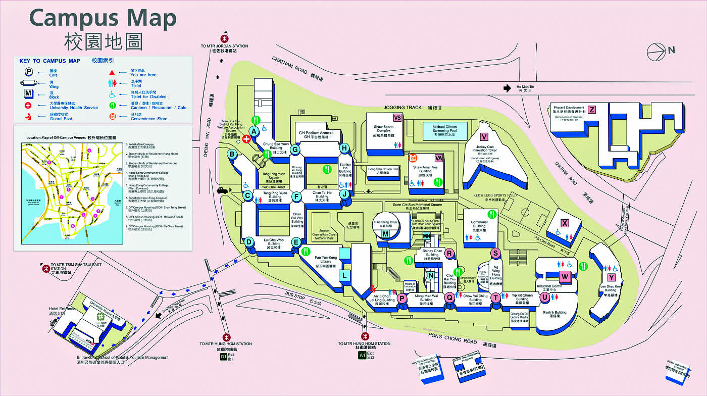 另一個與校園整體規劃有關的有趣特色是理大的建築命名和導向系統(Pathfinding)。建築的核心圓筒以英文字母命名,圓筒和圓筒之間的大樓則以兩側圓筒的英文字母組合為名稱,除此之外,每棟樓也會加上捐款人的名字。後期新建的獨棟建築稱為「座」(Block),以單個英文字母命名。說完這套規則,想必多數人已暈頭轉向。單元式的規劃模式雖整體性強,且為後期擴建提供便利,卻同時也存在場所感(Identity)缺乏的問題。即使作為建築師,走進校園也會覺得彷彿落入一個偌大的棋盤,腦中難以形成一套明確的空間感知地圖。