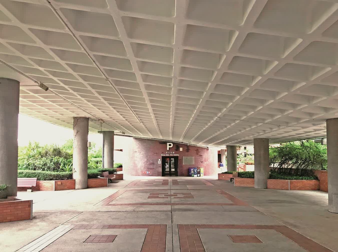 於是,乾脆放鬆心情,任由自己「迷失」在這沉靜的校園。港鐵紅磡站的行人天橋直達理大校門,不多遠就似乎被紅磚建築團團圍住,不辨東西。在一塊指示牌前,赫然發現已身處校園中心地帶──孫志新紀念廣場,廣場上穿梭着連續的有蓋行人天橋,金屬冷色調的結構在透視中彷彿時光隧道,不知要把人引到什麼未知的天地。架空首層的教學樓同樣為學生提供了大片陰涼,抬頭望去,密布的白色井字樑形成極有韻律感的圖案,與圓筒交接處居然呈現出斜線,引起我的好奇,頭頂上的內部空間究竟是什麼樣的?