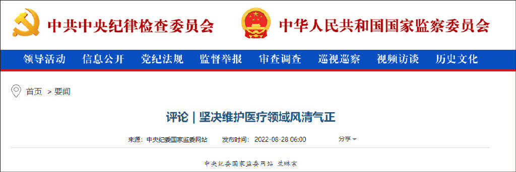 針對中南大學湘雅二醫院副主任醫師劉翔峰涉嫌嚴重違法被查問題,中紀委網站發表評論文章《堅決維護醫療領域風清氣正》強調,必須堅決清除損害醫療行業信譽的「害群之馬」,堅決挖出「靠醫吃醫」、啃食醫療資源的「蛀蟲」,堅決維護醫療行業清風正氣,維護醫護工作者的崇高形象,護佑人民群眾的生命健康。 以下為全文: