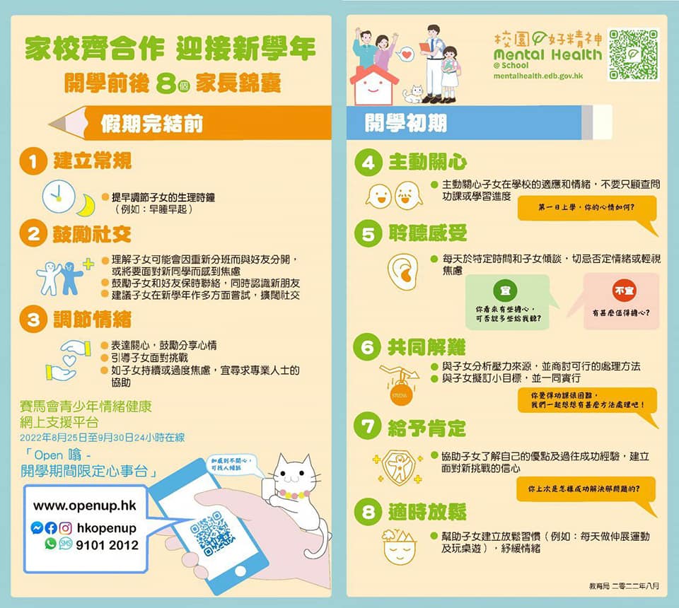 為幫助學生適應校園生活,提升抗逆力,教育局特別舉辦「正面迎接新學年 關愛守望在校園」網上研討會,協助教職員及早識別,照顧學生的精神健康需要。當局又製作「家校齊合作 迎接新學年」錦囊及電子提示卡,提供開學準備小貼士。此外,當局為每一位同學預備「每天好精神」鼓勵卡,讓學校於新學年的首兩個星期,善用這些鼓勵卡,為學生舉辦「新學年·好精神」活動。