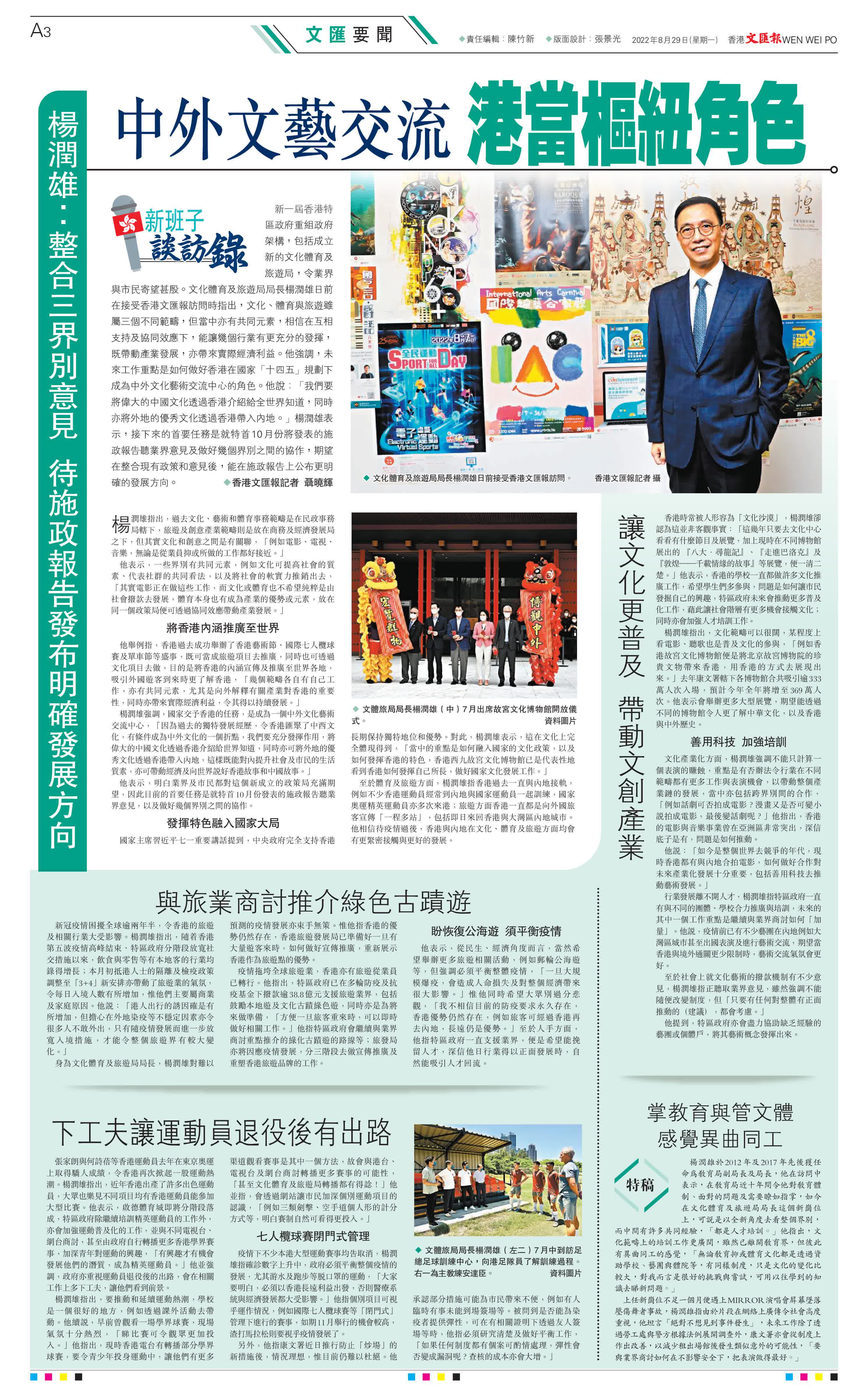 (香港文匯報 記者 聶曉輝)新一屆香港特區政府重組政府架構,包括成立新的文化體育及旅遊局,令業界與市民寄望甚殷。文化體育及旅遊局局長楊潤雄日前在接受香港文匯報訪問時指出,文化、體育與旅遊雖屬三個不同範疇,但當中亦有共同元素,相信在互相支持及協同效應下,能讓幾個行業有更充分的發揮,既帶動產業發展,亦帶來實際經濟利益。他強調,未來工作重點是如何做好香港在國家「十四五」規劃下成為中外文化藝術交流中心的角色。他說:「我們要將偉大的中國文化透過香港介紹給全世界知道,同時亦將外地的優秀文化透過香港帶入內地。」楊潤雄表示,接下來的首要任務是就特首10月份將發表的施政報告聽業界意見及做好幾個界別之間的協作,期望在整合現有政策和意見後,能在施政報告上公布更明確的發展方向。