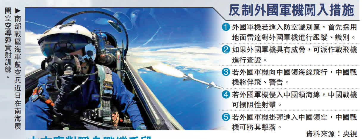 對於外國軍機,首先是進行監視、識別、查證,然後無線電發出警告,中英文雙語喊話要求其離開。對於拒不離開的挑釁者,戰機可採用靠近飛行、航線擠壓等方式,或進行高難度戰術動作、展示掛載武器、施放干擾彈等方式,對其施加壓力,迫使其離開相關空域。當然,如果戰機蓄意侵犯領空,構成軍事威脅時,終極手段將是發射導彈進行攻擊。