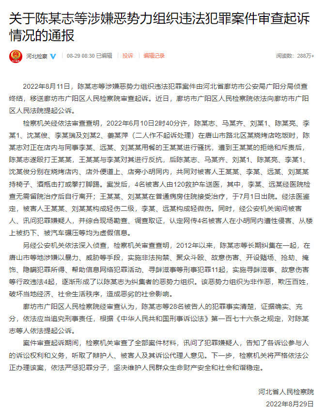 8月29日,河北省人民檢察院發布關於陳某志等涉嫌惡勢力組織違法犯罪案件審查起訴情況的通報稱,2022年8月11日,陳某志等涉嫌惡勢力組織違法犯罪案件由河北省廊坊市公安局廣陽分局偵查終結,移送廊坊市廣陽區人民檢察院審查起訴。近日,廊坊市廣陽區人民檢察院依法向廊坊市廣陽區人民法院提起公訴。