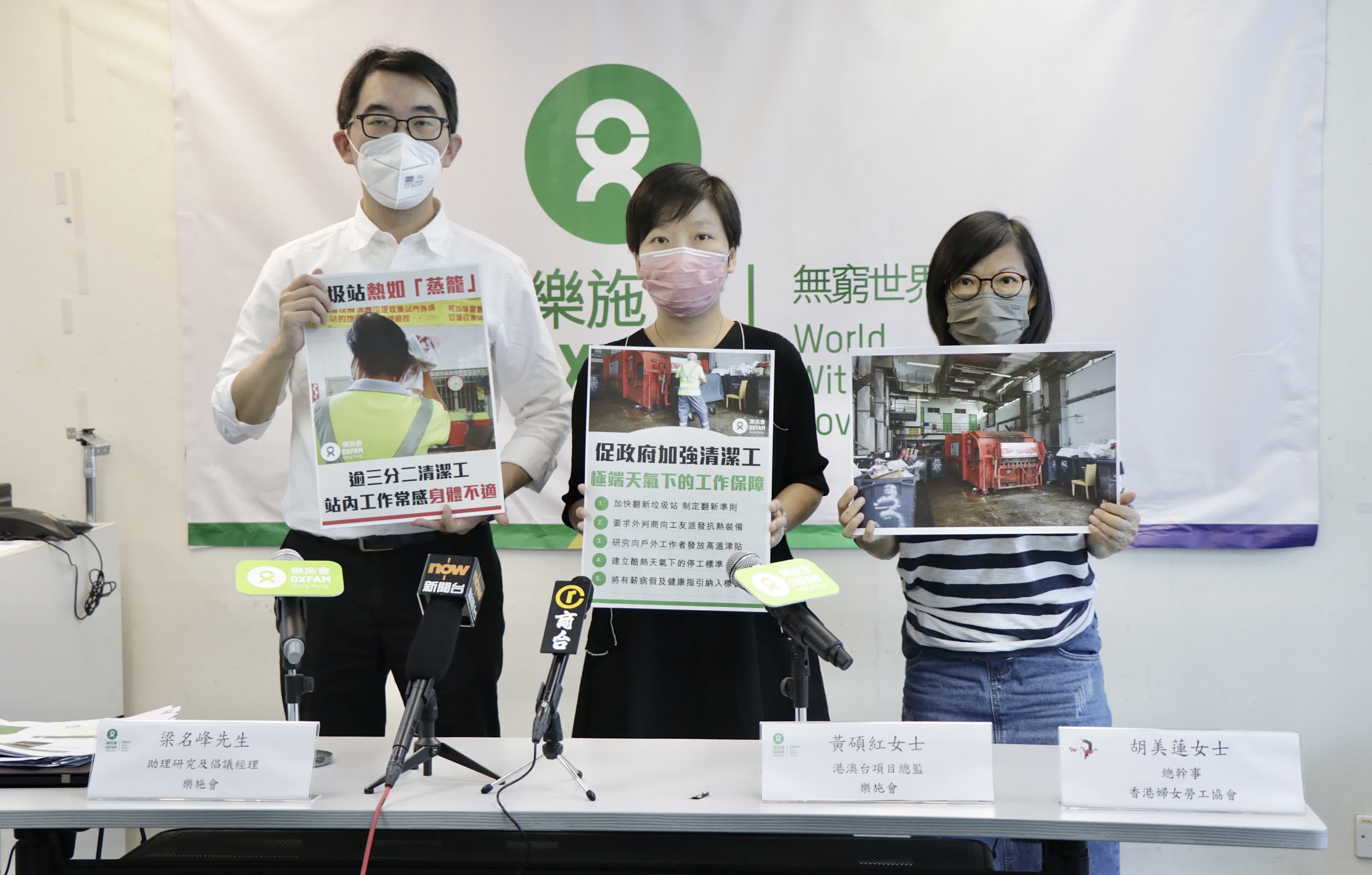 因此,樂施會提出五項建議,分別是當局在翻新或新建垃圾站時,須制定並嚴守改善準則,以及為全港垃圾站的翻新進度制定時間表;外判商應向工友派發抗熱裝備,包括小風扇、手袖、寬邊帽等,並納入「防暑指引」;政府可研究向戶外工作者發放高溫津貼;以及建立酷熱天氣下的停工標準,以客觀指標保障工友健康;最後是將「工作安全及健康指引」及有薪病假納人政府外判標書的要求,從制度上保障工友的健康。
