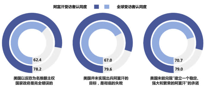 2001年,美國以反恐為名發動阿富汗戰爭。在受訪的阿富汗民眾中,有78.2%的受訪者卻認為「美國以反恐為名推翻另一個主權國家政府的做法是完全錯誤的」,在全球也有62.4%的受訪者持相同觀點。此外,有79.6%的阿富汗受訪者認為「美國並沒有實現當時出兵的目標,是徹底的失敗」,這一比例在全球受訪者中也達到67%。
