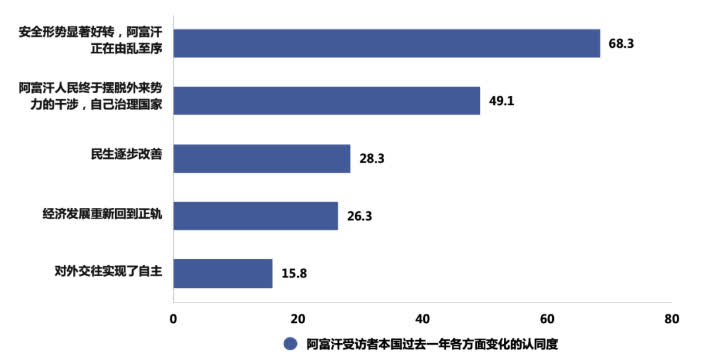 當前,阿富汗正處在由亂及治的關鍵時期。在阿富汗受訪者看來,過去一年當地局勢的諸多變化中,位列前三的分別是「安全形勢顯著好轉」「阿富汗人民擺脫外來勢力干涉,自己治理國家」和「民生逐步改善」,佔比分別為68.3%、49.1%和28.3%。