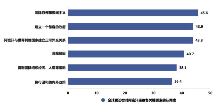 調查中,有近六成全球受訪者(58.7%)對阿富汗的重建表達了樂觀的預期。在全球受訪者心中,阿富汗重建的關鍵因素位列前三的分別是「消除恐怖和極端主義」(45.6%)、「建立一個包容的政府」(43.9%)和「與世界其他國家建立正常外交關係」(43.8%)。