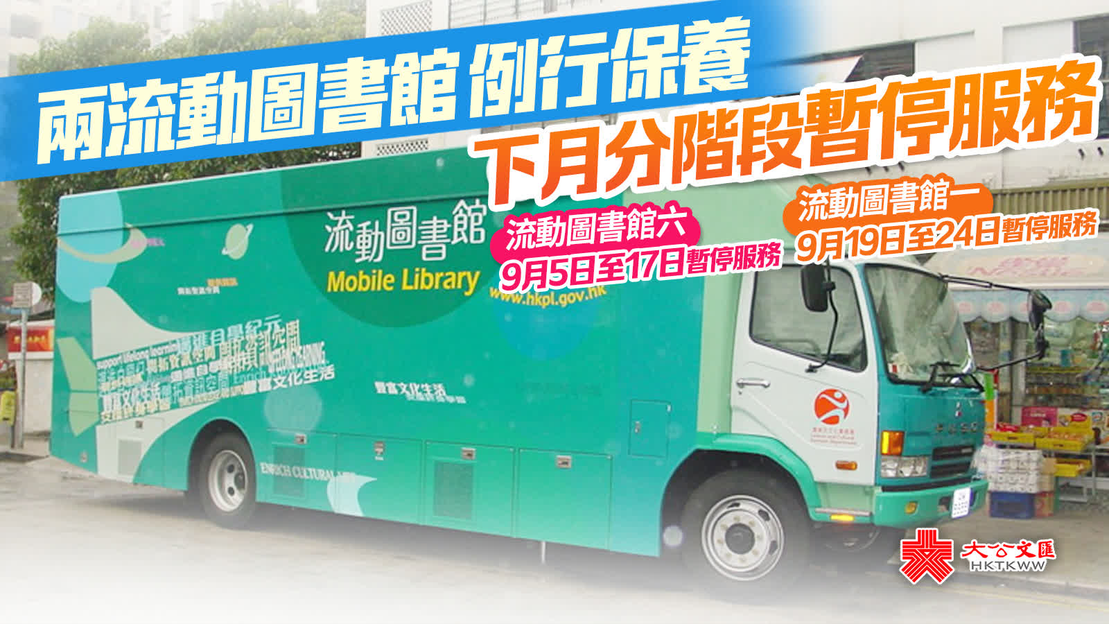 大公文匯全媒體報道,康文署發言人今日(29日)宣布,流動圖書館一及六將於九月不同時段暫停服務,以便進行例行保養維修工程。