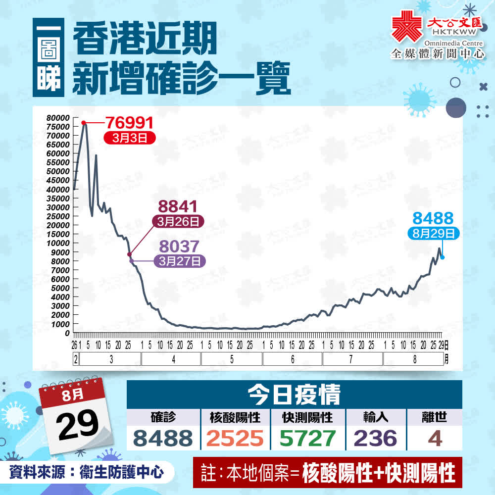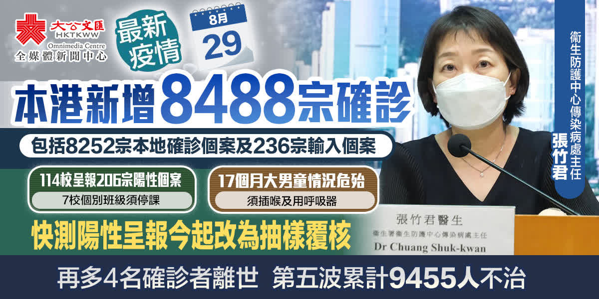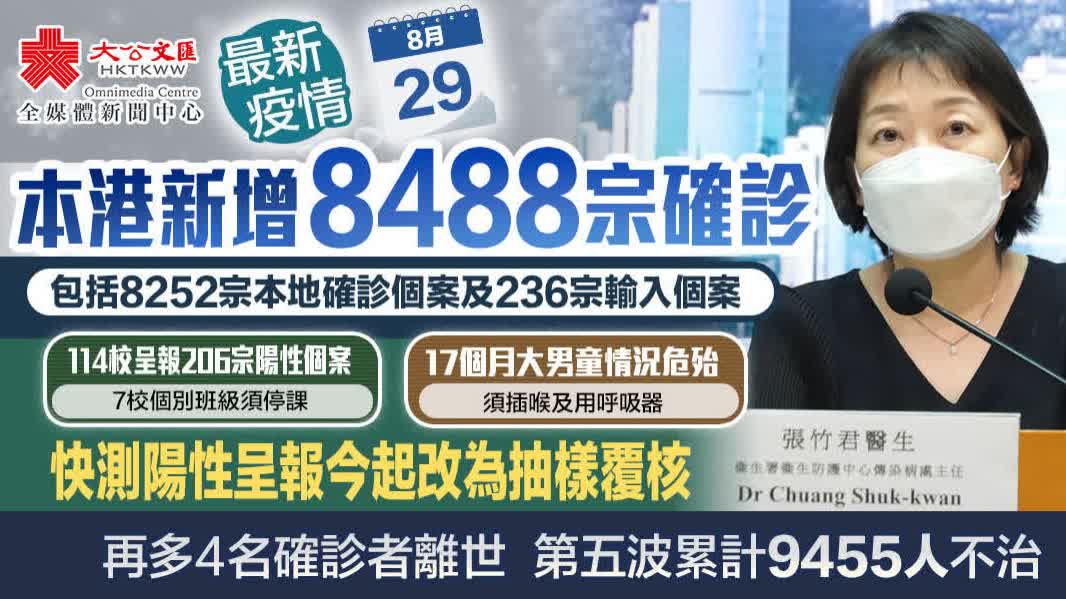 大公文匯全媒體報道,香港第五波疫情反彈持續,衞生署及醫管局今日(29日)下午舉行疫情記者會。衞生防護中心傳染病處主任張竹君公布,截至今日零時,本港新增8488宗確診個案,包括8252宗本地確診個案及236宗輸入個案。本地確診個案當中,2525宗為核酸檢測確診,5727宗為快測陽性且核酸覆核陽性個案。