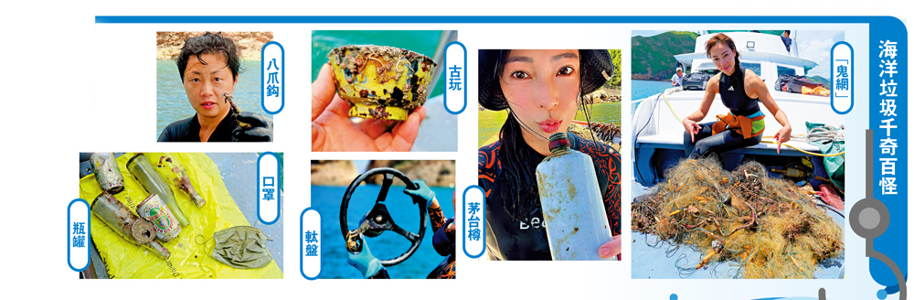 「執了咁多年海底垃圾,除了「鬼網」,最常見是玻璃樽、汽水罐和膠袋,執過的垃圾由洗衣機、床褥、引擎、冷氣機,包括今次的軚盤,甚至連關公瓷像、茅台樽、麻將都有,次次新鮮,次次不同!」垃圾數量與種類之多令人咋舌,身兼資深潛水教練的藝人余曉彤說時十分感慨。