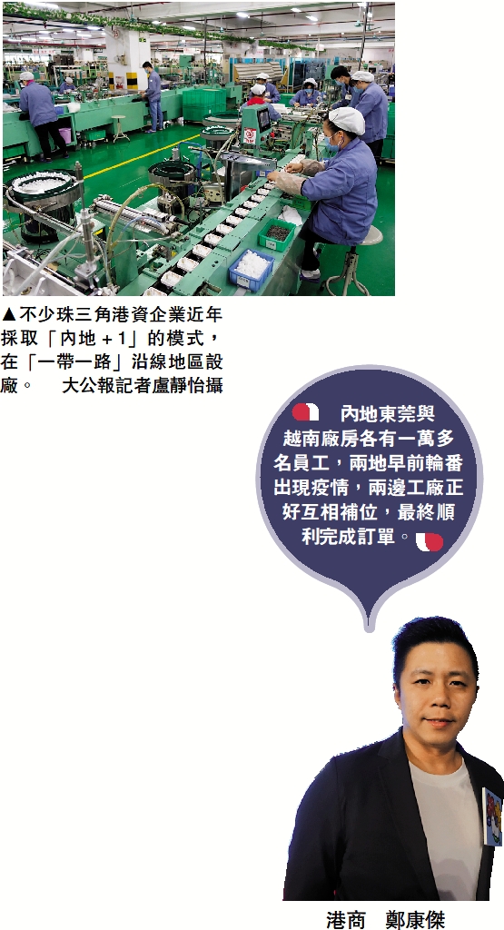 港商鄭康傑的家族在東莞長安鎮創辦一家勞動密集型服裝企業,再出海到越南設廠。他對《大公報》表示:「現時東莞廠房有一萬多名員工,越南工廠員工同樣有一萬多名。在中國內地和越南兩地輪番出現疫情的時候,兩邊工廠正好互相補位。前段時間越南疫情嚴重,生產受到影響,因而將訂單轉到東莞生產,最終順利完成訂單。」
