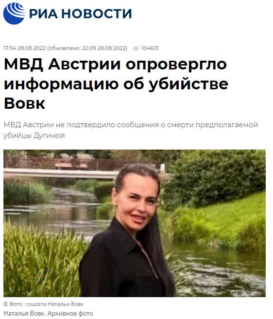 奧地利小報Exxpress在28日的報道中宣稱,被俄羅斯官方指控涉嫌謀殺俄知名社會學家杜金之女、記者杜金娜的烏克蘭公民沃夫克已經死亡。沃夫克 「被發現死在租來的公寓裏」「手裏拿着便條,身中17刀」。