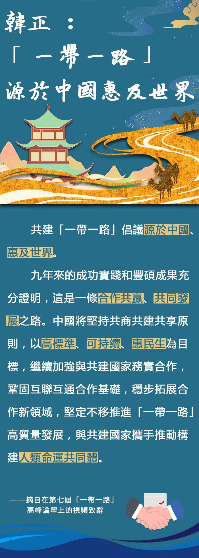 韓正最後說,共建「一帶一路」倡議源於中國、惠及世界。九年來的成功實踐和豐碩成果充分證明,這是一條合作共贏、共同發展之路。中國將堅持共商共建共享原則,以高標準、可持續、惠民生為目標,繼續加強與共建國家務實合作,鞏固互聯互通合作基礎,穩步拓展合作新領域,堅定不移推進「一帶一路」高質量發展,與共建國家攜手推動構建人類命運共同體!