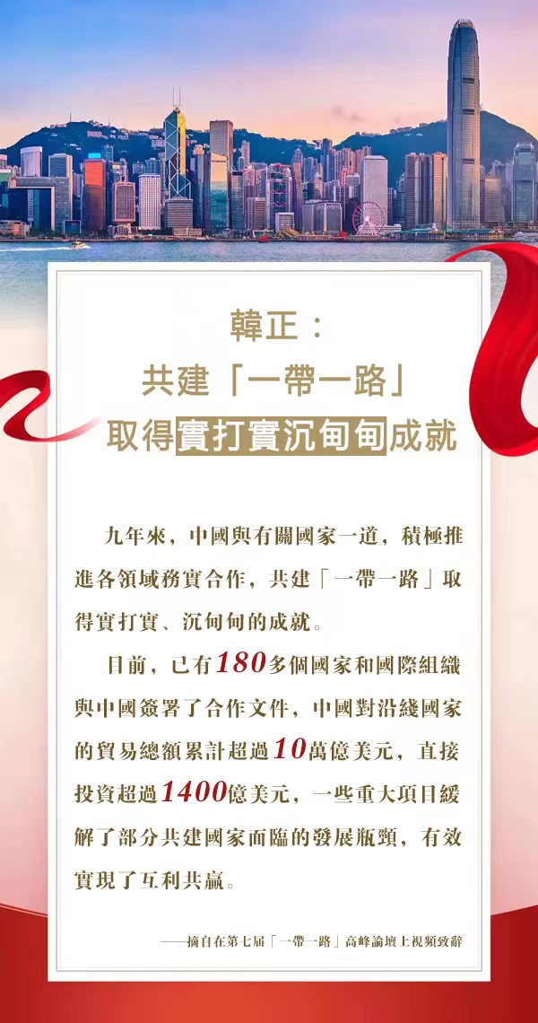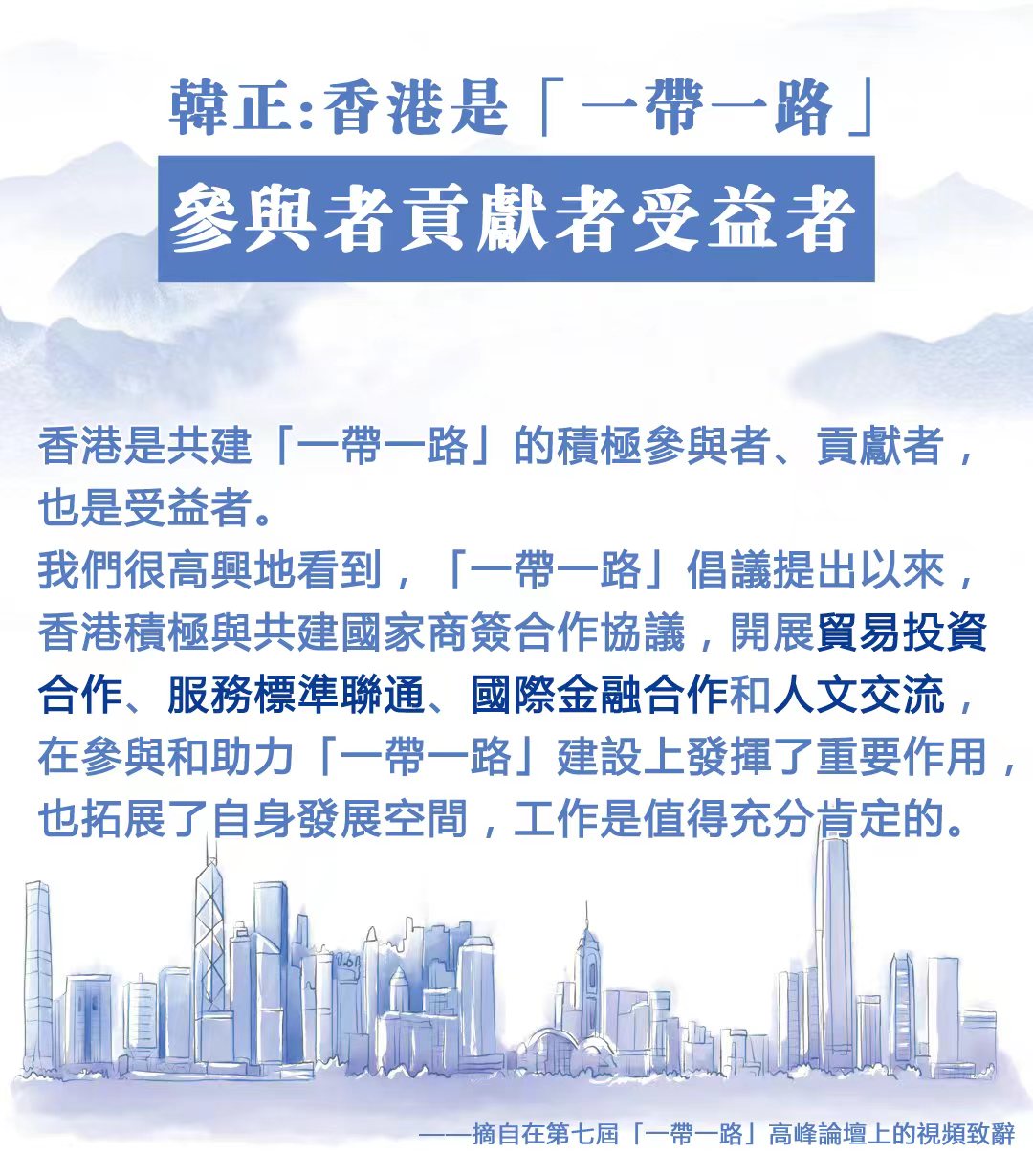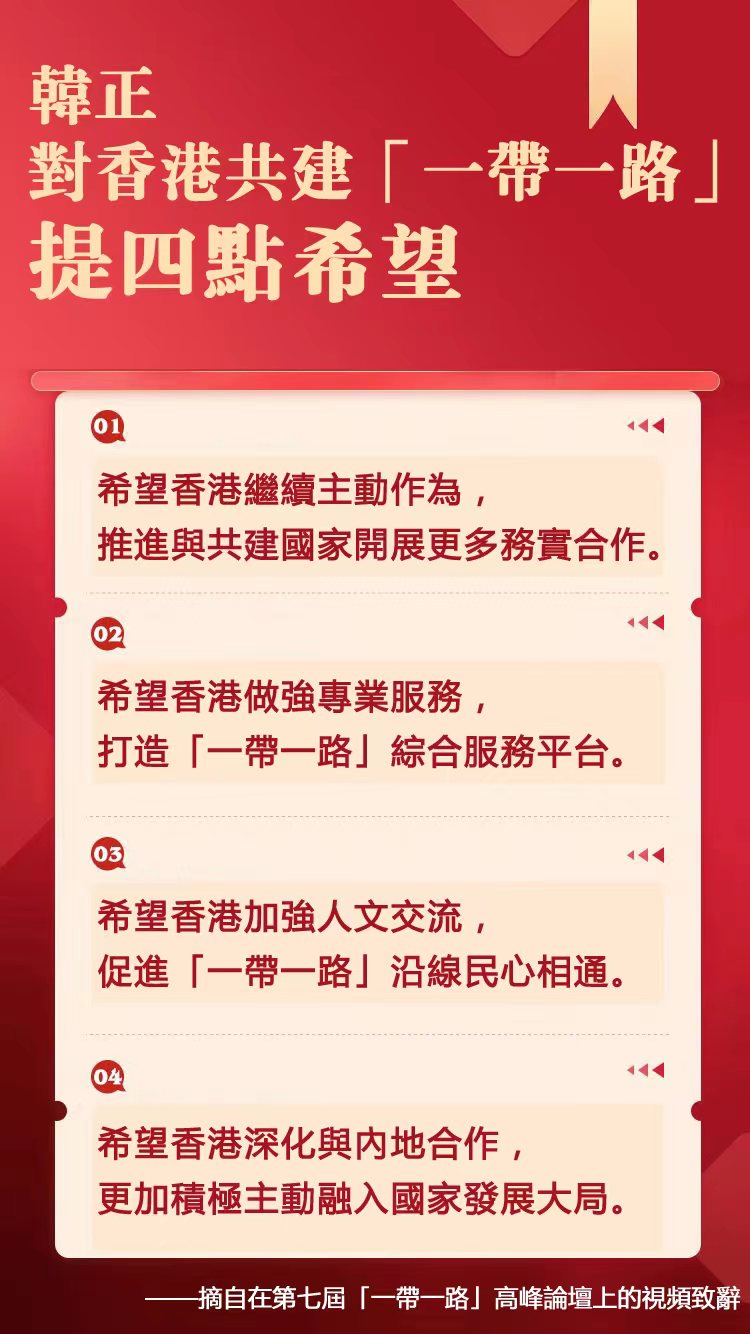 此外,韓正亦對香港如何更好地參與和助力「一帶一路」建設,提出了四點希望。包括希望香港繼續主動作為,推動與共建國家開展更多務實合作;希望香港做強專業服務,打造「一帶一路」綜合服務平台;希望香港加強人文交流,促進「一帶一路」沿線民心相通;以及希望香港深化與內地合作,更加積極主動融入國家發展大局。
