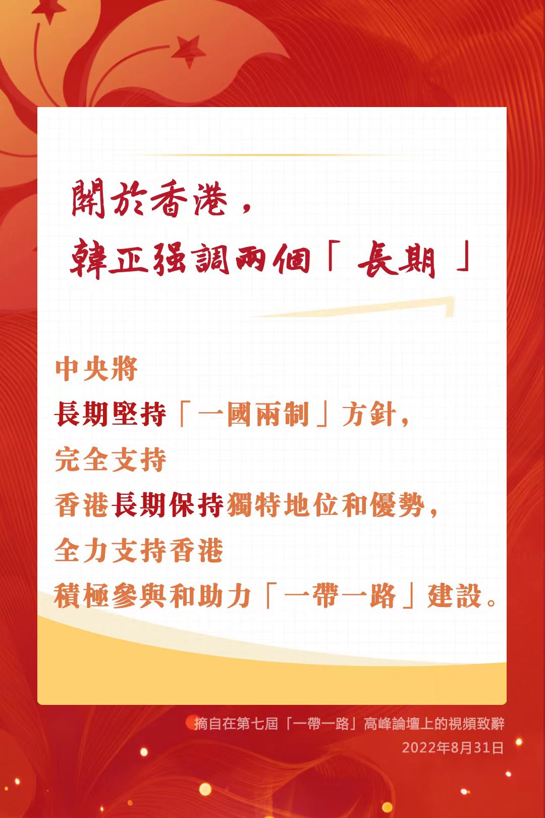 關於香港,韓正強調了兩個「長期」——中央將長期堅持「一國兩制」方針,完全支持香港長期保持獨特地位和優勢,全力支持香港積極參與和助力「一帶一路」建設。