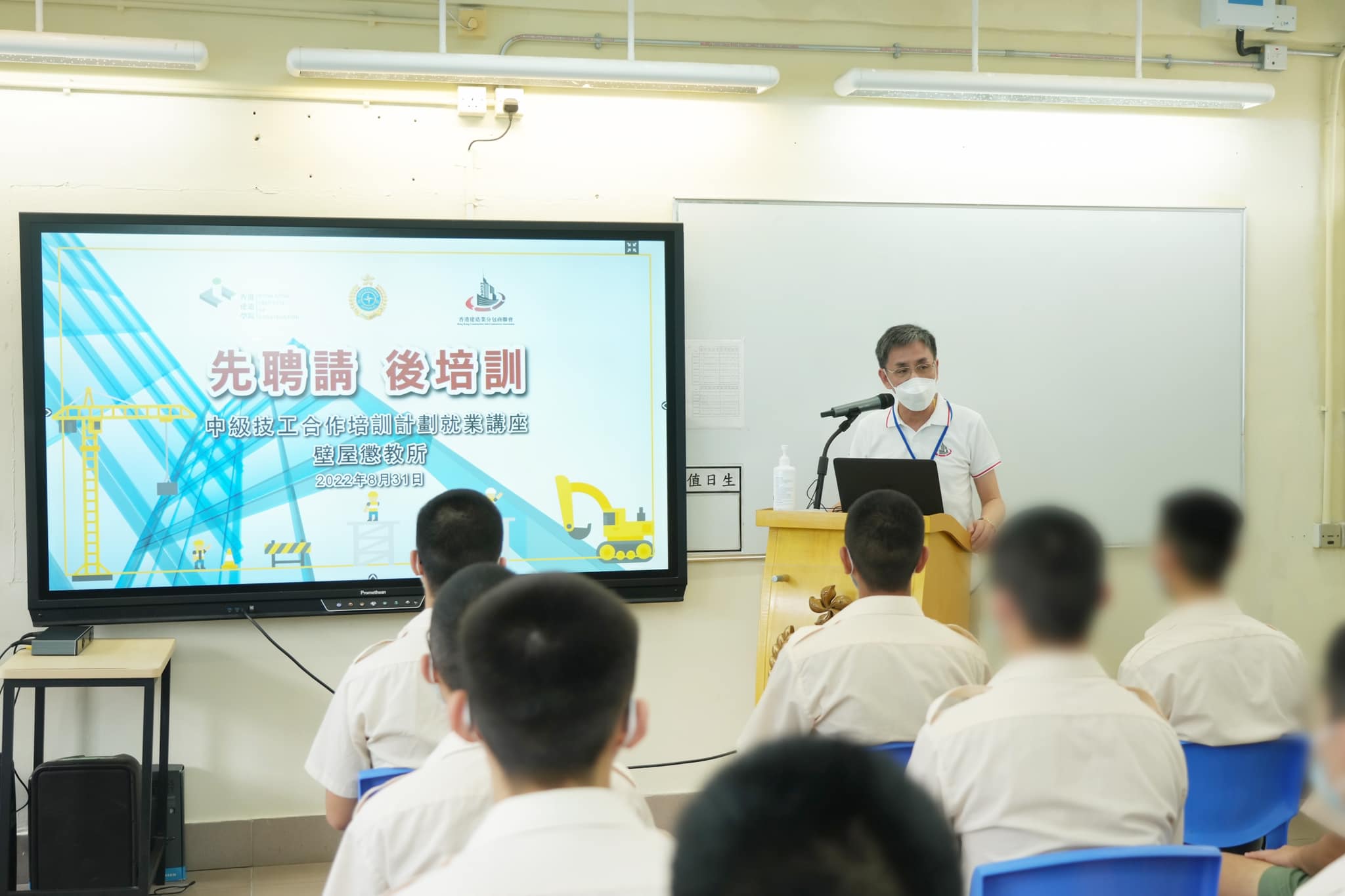 本次活動邀請香港建造業分包商聯會會長伍新華、主席陳劍光及司庫陳述浩出席。伍新華表示,建造業不同工種對人力資源,尤其是年輕人的需求十分殷切,故此建造業議會和分包商聯會今年合作推出了「先聘請,後培訓」在職培訓計劃,參加者先由僱主聘請,並會按工種於接受香港建造學院的前期培訓後,到僱主的工地接受在職培訓,為考取相關的中級工藝測試或資歷作準備。他很高興能與懲教署合作舉辦這次講座暨招聘會,不但能為建造業界尋找新血,又能協助在囚人士在獲釋後可立刻投入工作,盡快重過新生。