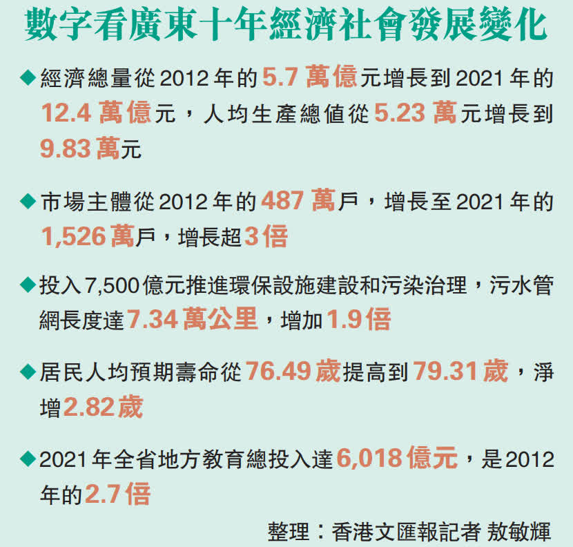 他表示,廣東全力服務「一國兩制」大局,攜手港澳推進粵港澳大灣區建設,順利建成港珠澳大橋、廣深港高鐵等標誌性工程,國際一流灣區和世界級城市群建設邁出堅實步伐。2021年,大灣區經濟總量達12.6萬億元,比2017年增加2.5萬億元。