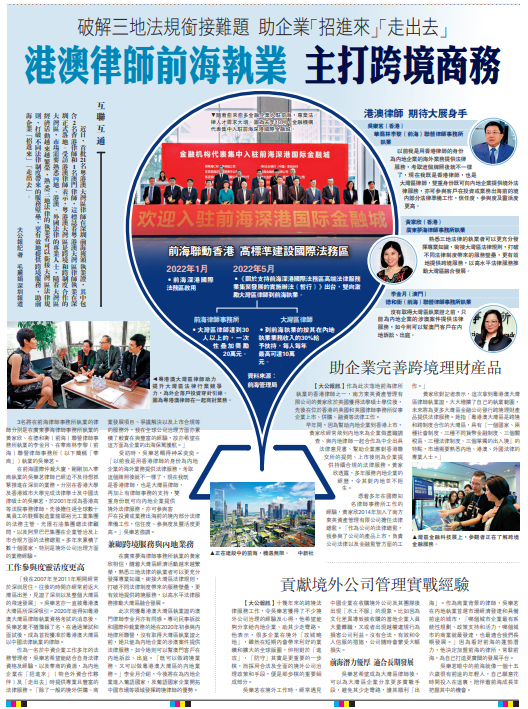 受訪時,吳樂茗顯得神采奕奕。「以前我是用香港律師的身份為內地企業的海外業務提供法律服務,考取這個牌照後就不一樣了,現在我既是香港律師,也是大灣區律師,再加上有律師事務的支持,雙重身份既可向內地企業提供境外法律服務,亦可參與客戶在投資或業務出海前的境內部分法律準備工作,信任度、參與度及靈活度更高。」吳樂茗強調。