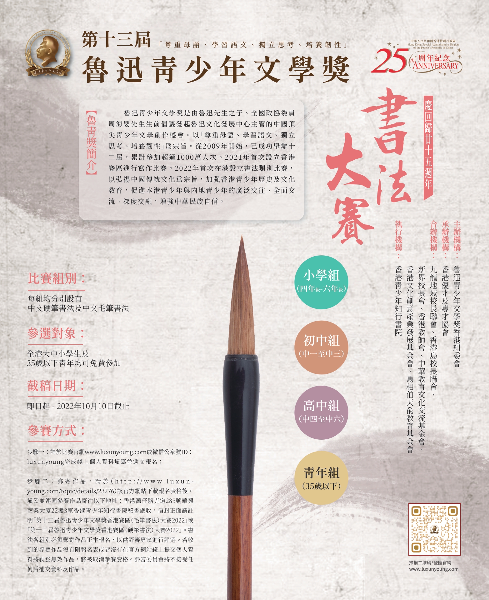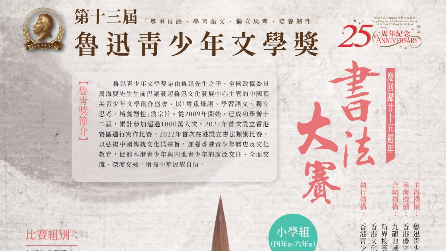 大公文匯全媒體報道,為慶祝香港回歸祖國25周年,第十三屆魯迅青少年文學獎香港賽區書法比賽今日(9月1日)正式啟動。即日起,全港大中小學生及35歲以下青年均可免費參加,徵稿截止日期為10月10日。
